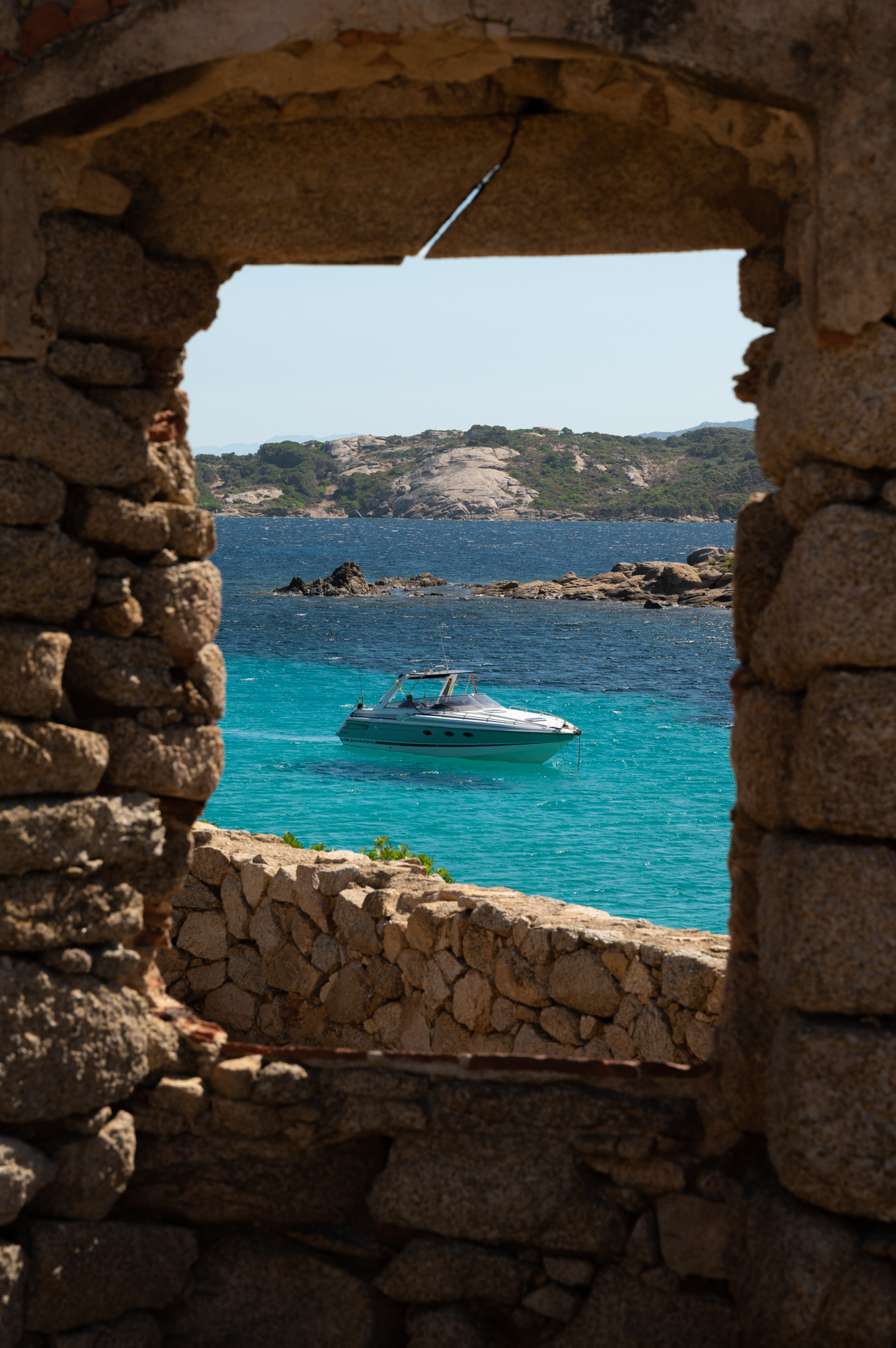 An der Bucht schließlich liegt die Ruine eines alten Steinhauses. Man kann es vollständig begehen. Durch das Fenster präsentiert sich ein kleines Sportboot. Der Schatten ist eine mehr als willkommene Abwechslung zu der gleißenden Hitze. Unsere Körper bekommen wieder Gelegenheit dazu, Normaltemperatur anzunehmen.