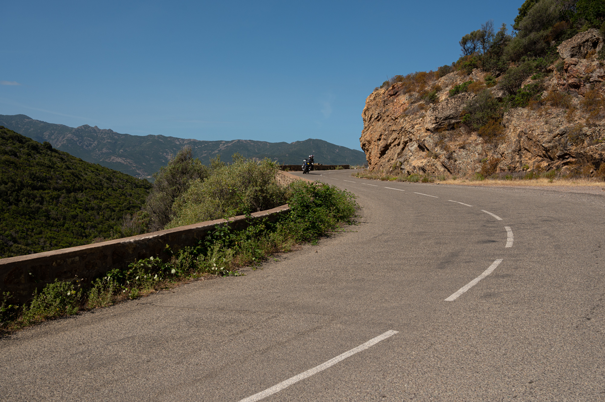 Heute Morgen herrscht bei uns Aufbruchstimmung. Wir lassen den Nordwesten Korsikas langsam aber sicher hinter uns und peilen unsere nächste Basis an: Porto an der Westküste. Das Rucksackpacken ist eingespielt, der Kofferraum unseres kleinen Fiats wird bis an den Rand gefüllt. Er ist erstaunlich geräumig: Zwei große Wanderrucksäcke, ein Sechser Wasser und ziemlich viel Kleinkram passen da rein. Die Bude hinterlassen wir besenrein, auch wo der Müll zu entsorgen ist, war Teil unseres Willkommensbriefings vor drei Nächten. Die übliche Mischung aus Wehmut und Entdeckergeist legt sich über uns. Ein Teil der Wegstrecke ist uns vertraut: Es ist die Straße über den Parkplatz von La Revellata, die die Küste südwärts Richtung Porto und Ajaccio führt. Kurz hinter dem Parkplatz ändert sich sehr schnell auch die Beschaffenheit der Straße. Sie wird löchriger, deutlich enger und nur eine alte, schmale, hüfthohe Mauer trennt die Straße vom steilen Gefälle. In den Kurven fährt man teilweise Schrittgeschwindigkeit. Ob Manöver nötig werden, ist Glückssache. Glücklicherweise sieht man an vielen Stellen entgegenkommenden Verkehr schon von Weitem, so dass man vorausschauenderweise einfach in eine der zahlreichen Haltebuchten einschwenkt, sollte es sich mal um breitere Fahrzeuge handeln. Die Reisebusdichte nimmt zu, die Motorradfahrer fahren eher Ideallinie als auf ihrer Spur zu bleiben. All das führt dazu, dass wir eher gemächlich vorwärts kommen. Aber im Cabrio mit guter Musik dazu lässt sich das sehr gut aushalten.