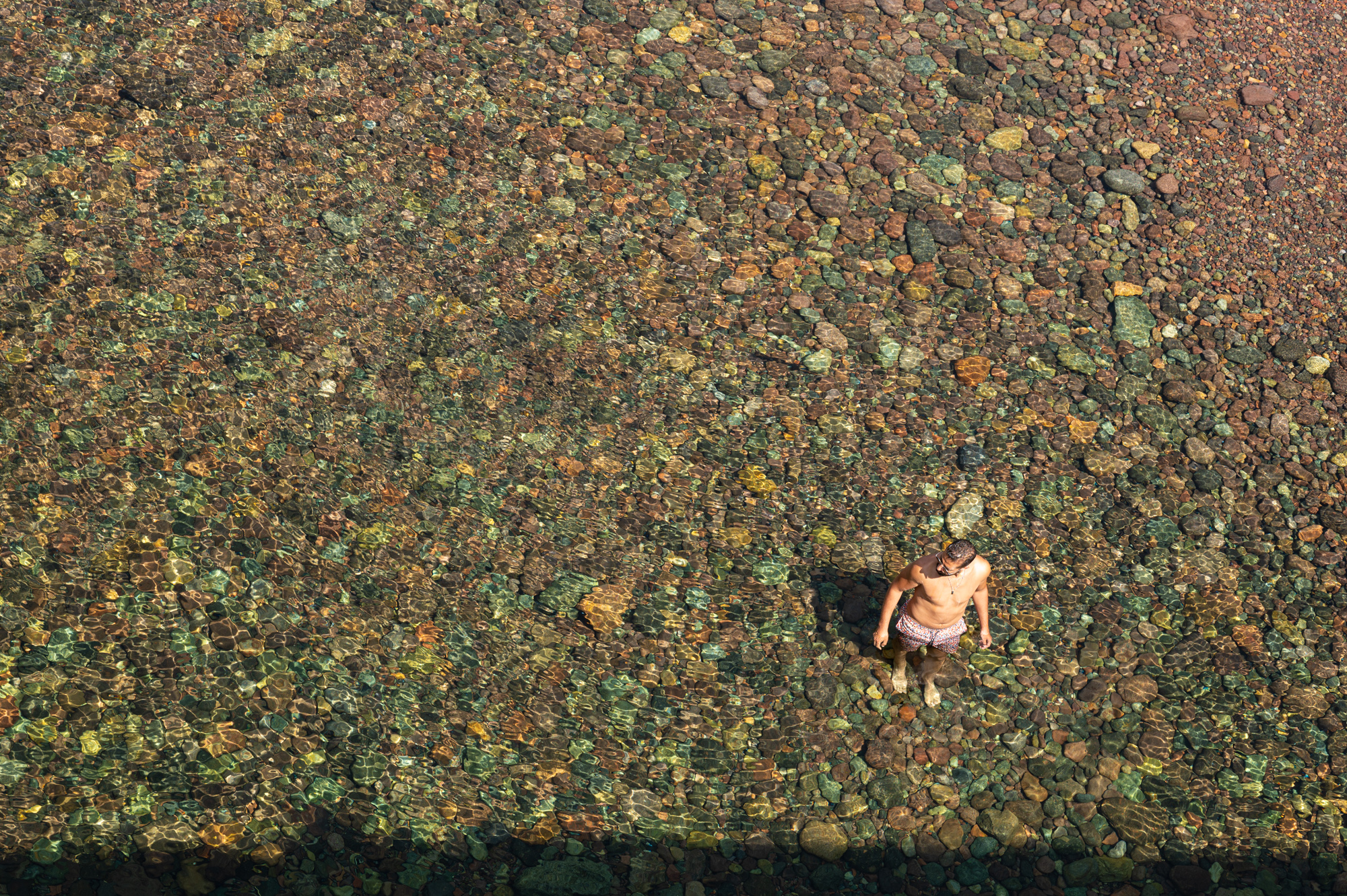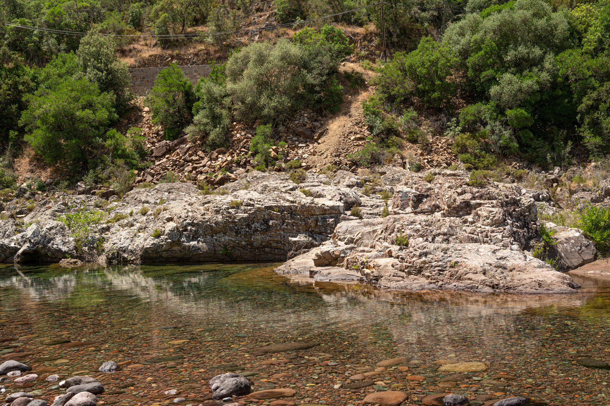 Wir entscheiden uns für den obersten Parkplatz, kurz bevor sich die Straße vom Flussverlauf abkoppelt. Es haben sich hier bereits einige Familien bequem gemacht. Wir staksen einige Meter durch den Wald flussabwärts und sind plötzlich ganz allein. Der Fluss macht hier eine Biegung. Führte er noch einige Meter zuvor sehr flach durch die großen Steine, ist die Stelle hier tiefer, sodass man sogar schwimmen kann. Das Wasser ist glasklar und so warm, dass man sogar von der Sonne aufgeheizt einfach so reinspazieren kann. Die sattgrüne Natur, das angenehme Wasser und die Illusion der absoluten Einsamkeit sorgen für eine unglaublich idyllische Stimmung. Aus der Badestelle ragt ein großer Felsbrocken heraus. Auch unter der Wasseroberfläche hat er einige Ausläufer, auf die man sich wie auf eine Unterwasserliege legen kann. Eine Landschaft als wäre sie als Wellnesslandschaft designt. Auf der Wasseroberfläche sind nur einige Wasserläufer zu erkennen. Ab und zu eine Libelle, die vorbeifliegt. Wirklich nirgends Müll: Weder auf dem Parkplatz, noch am Flussufer oder gar im Fluss. Nicht ein Taschentuch, Bonbonpapier oder Dose. Uns ist es ein Rätsel, wie man das hier generell so sauber hinbekommt und auch erhält. Diesen Ort in Deutschland können wir uns bei aller Fantasie nicht vorstellen. Ich frage Teresa, welche Orte die für sie beeindruckendsten bisher waren. Also die Orte, die den nachhaltigsten Eindruck hinterlassen haben: Das Trusotal in Georgien und der Strand Li Cossi auf Sardinien. Ich komme zu einem ähnlichen Ergebnis. Und nun rutscht bei mir dieser Ort auf Platz eins. Es ist ein Ort, den man in der Erinnerung nur geglaubt haben wird, geträumt zu haben. Ein Ort, mit dessen intensiven Eindruck ich heute sicher nicht gerechnet habe. Ein kleines Paradies, das so perfekt und so unberührt wirkt, als wäre er eine Illusion.