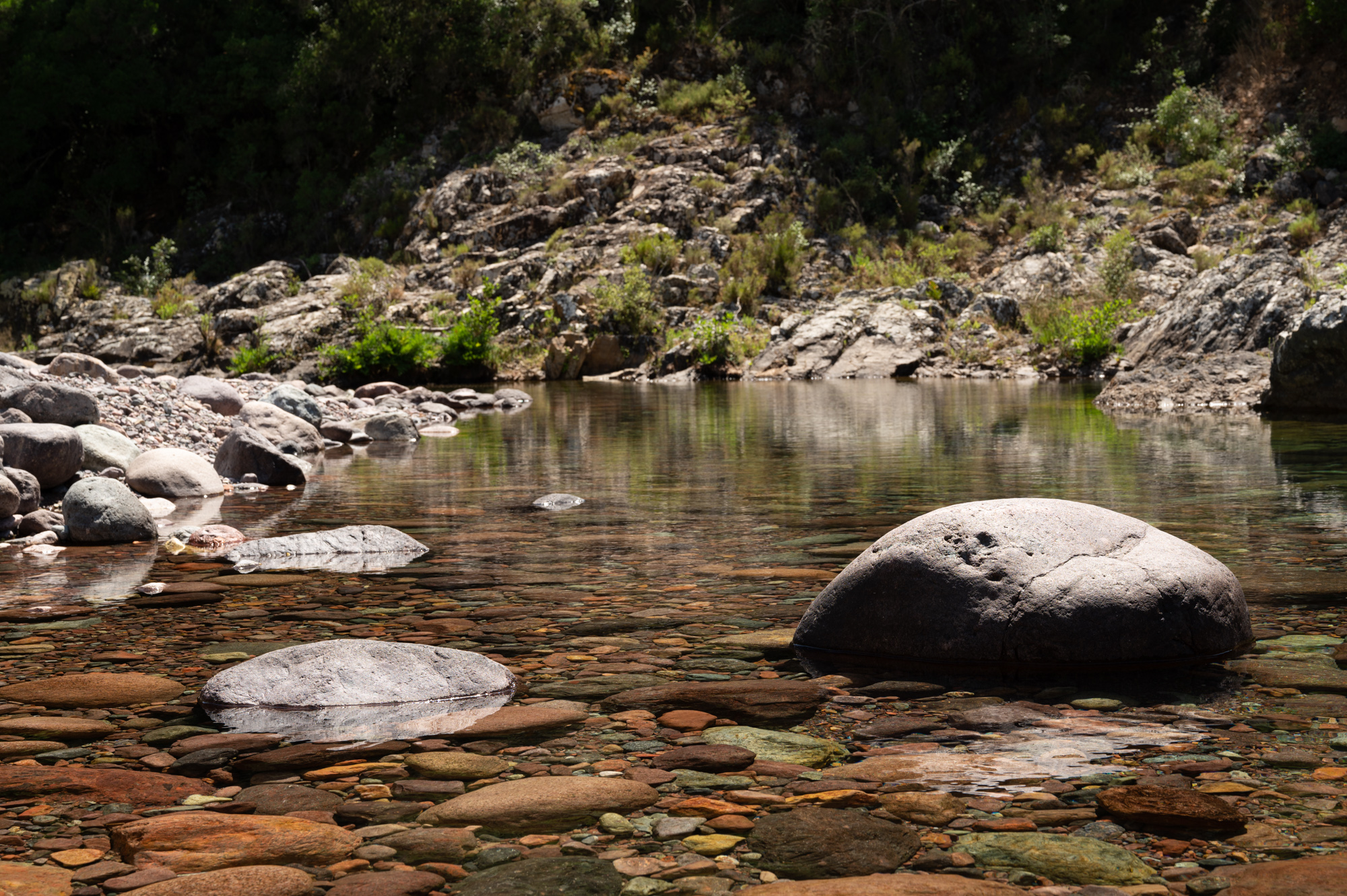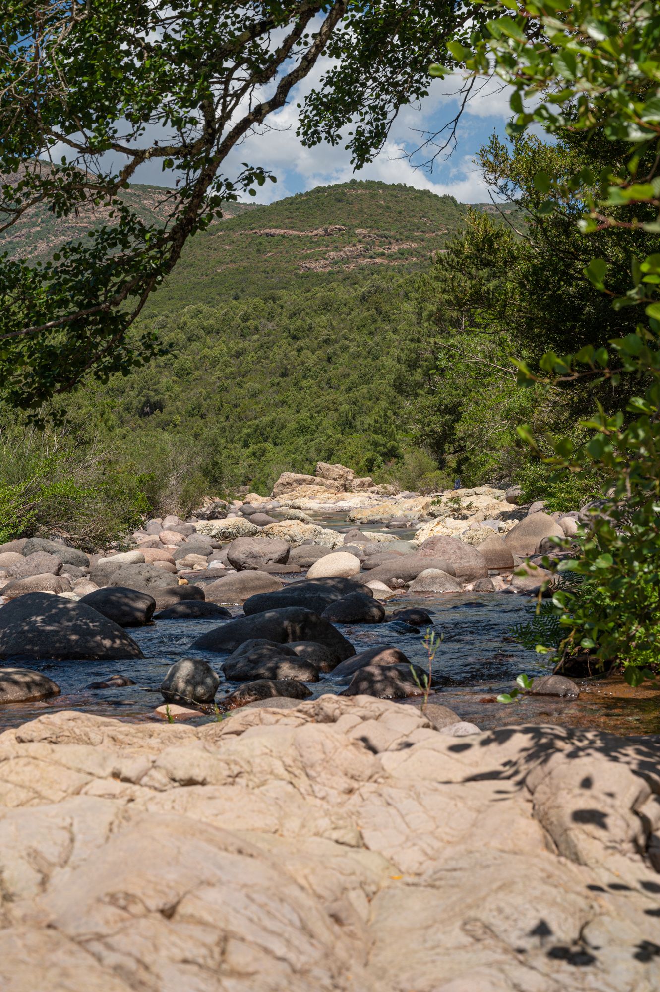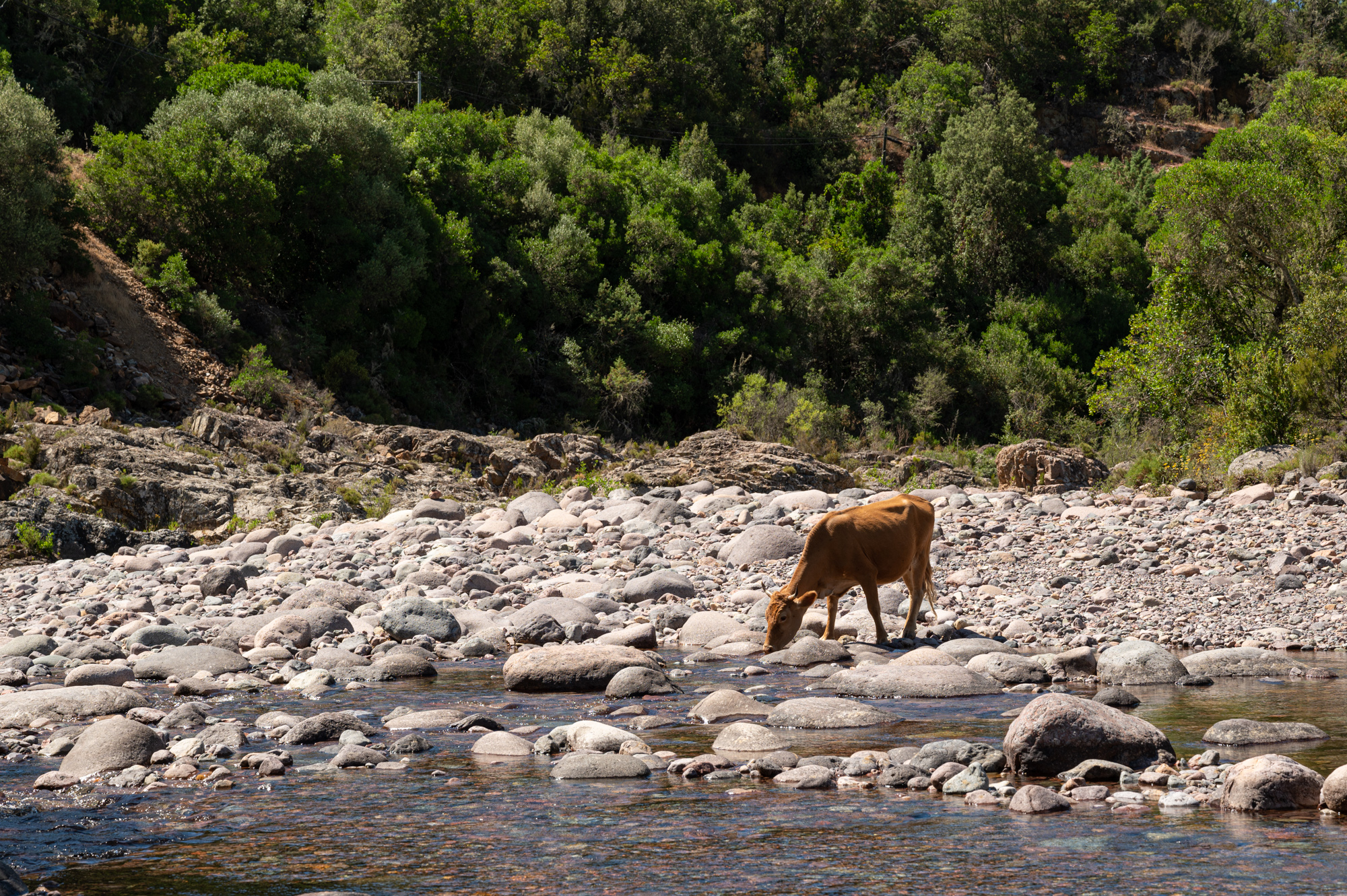 Wir stärken uns mit ein wenig Obst. Die korsischen Pomelos sind ziemlich saftig und wohlschmeckend. Ziemlich guter Snack bei der Hitze. Als wir kurz darauf zusammenpacken, kommt eine Gruppe Jugendlicher und lässt sich an unserem Platz nieder. Auch gutes Timing, ihr kleines Erlebnis mit dem Paradies kann ganz ungestört beginnen, während unseres zu Ende geht. Durch das knöchelhohe Wasser waten wir wieder zurück an die andere Uferseite. Als ich mir die Füße abtrockne, steht - wie aus dem nichts - eine Kuh am Ufer. Sie stillt ihren Durst und ist kurz darauf genauso schnell wieder im Dickicht verschwunden, wie sie aufgetaucht ist.
