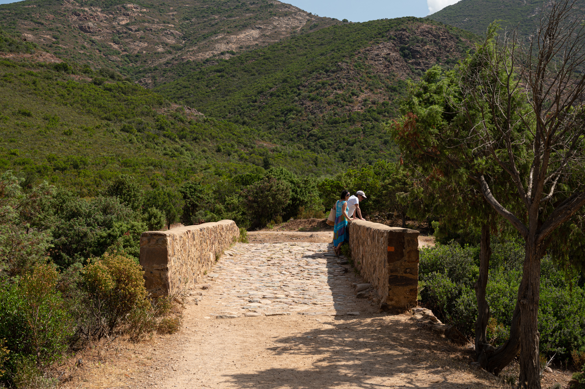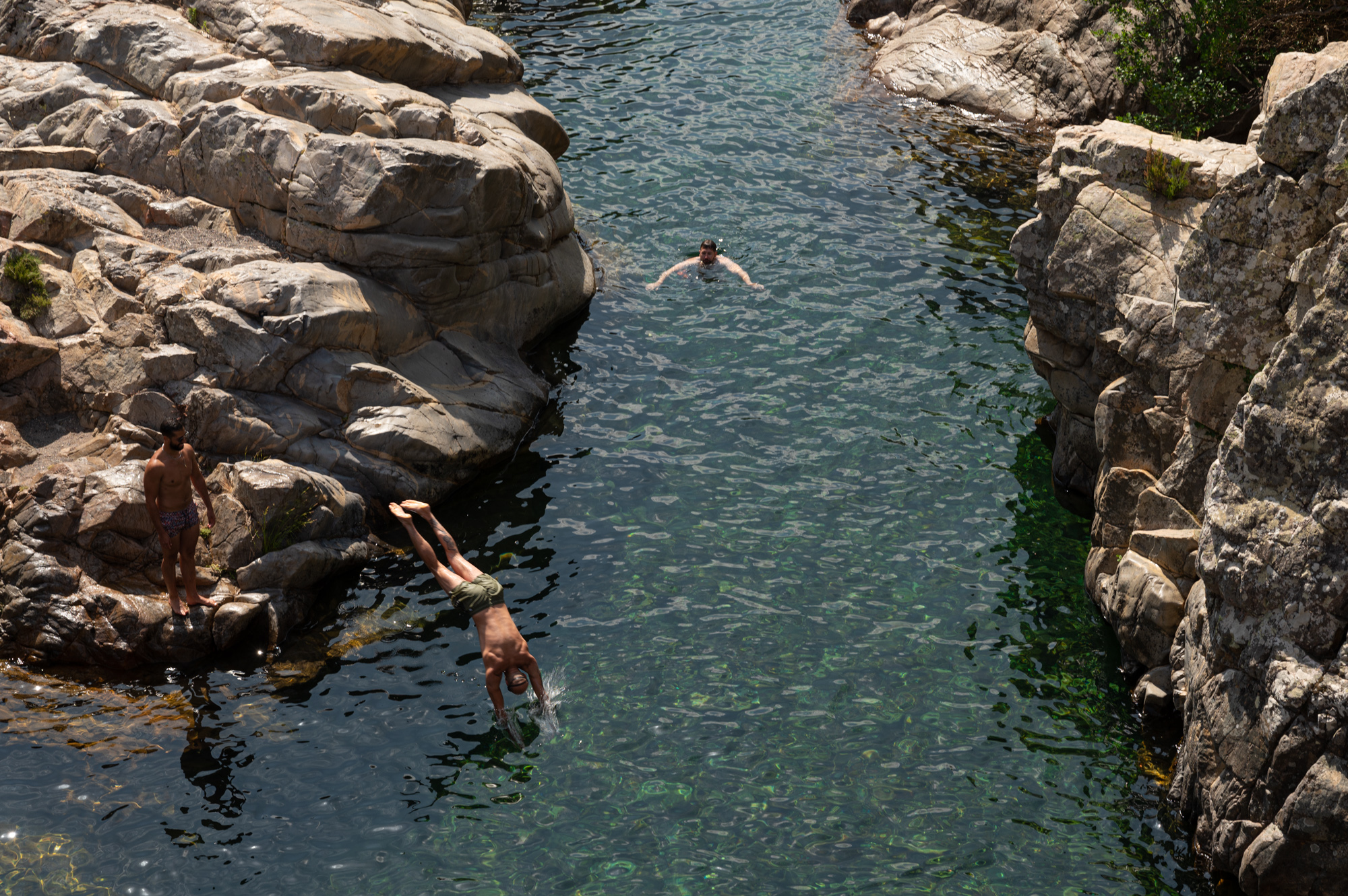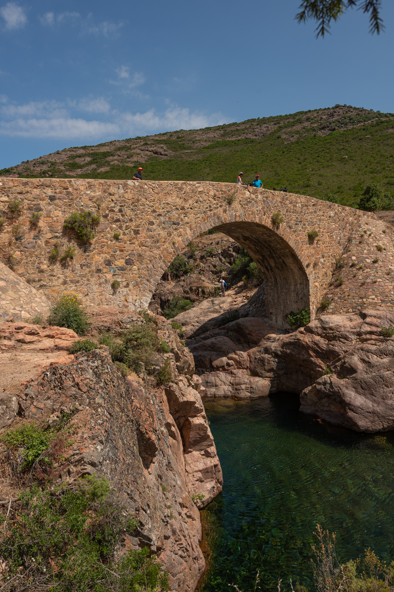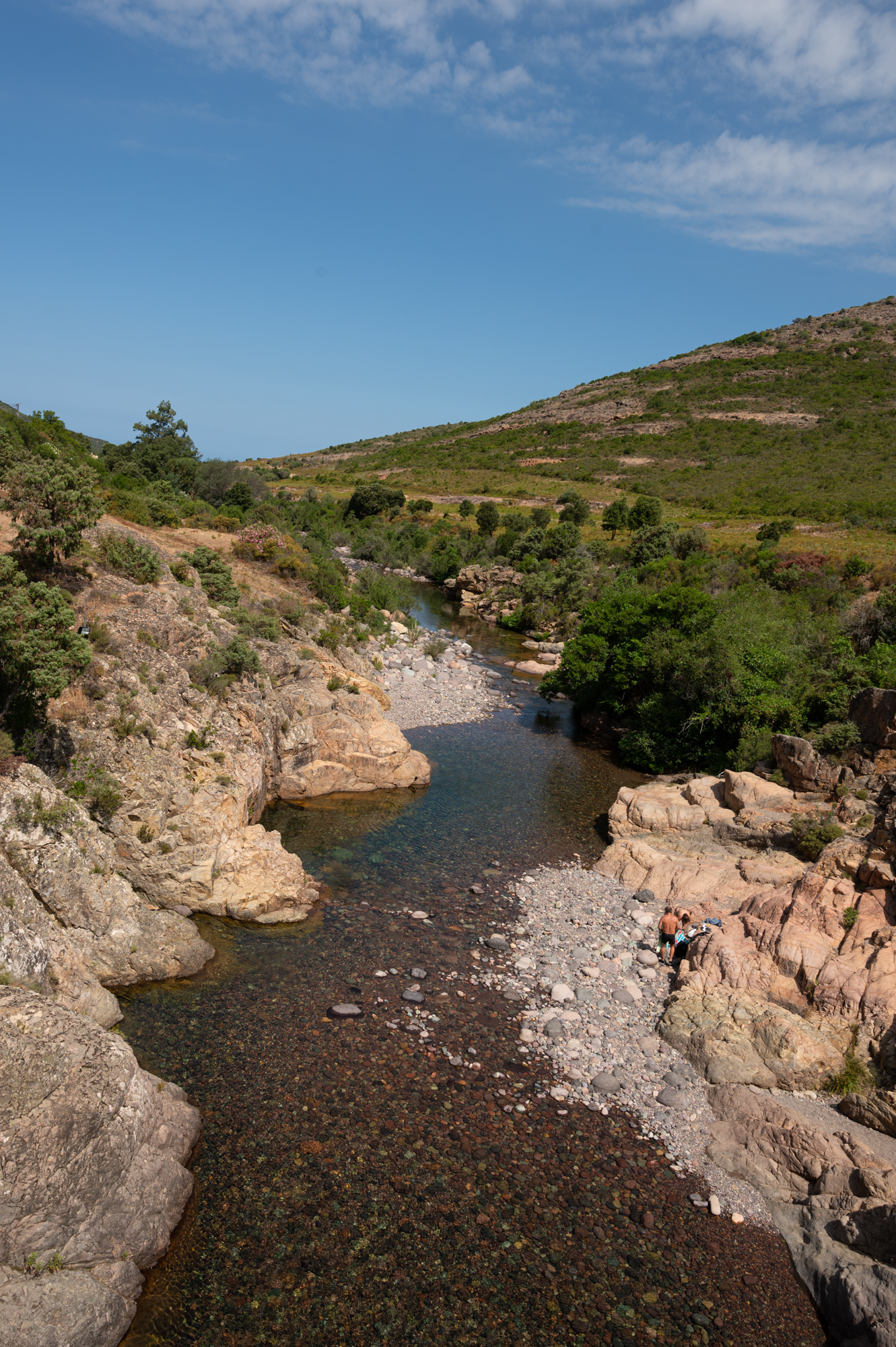 Unsere Gastgeberin in Calvi hat uns sehr in unserem Vorhaben bekräftigt, auf dem Weg nach Porto einen Halt im Fangotal zu machen. Wir sollten uns gut eincremen, wegen der reflektierenden Felsen. Als wir auf den ersten Parkplatz rollen, an dem sich auch ein kleines Infohäuschen befindet, ahnen wir noch nicht, wie sehr uns der Anblick von der kleinen Brücke, dem "Ponte Vecchio", nebenan begeistern wird. Hier, etwas weiter flussaufwärts führt der Fango noch Wasser. Auf den Felsen haben es sich einige Menschen bequem gemacht. Es sind nicht viele, es verläuft sich ganz gut. Ein paar junge Männer springen in eine tiefere Stelle. Alle haben Spaß und sind begeistert. Das ist der langsam fließende Teil des Fango, der der Sonne ausgesetzt durch ein felsiges Flussbett führt. Es gibt noch einen steileren, durch Wald führenden Teil. Der soll deutlich kälter sein. Die Straße führt noch einige Kilometer flussaufwärts. Man könnte auch hier schon den Flussverlauf hochwandern und an beliebiger Stelle Halt machen. Danach ist uns heute aber nicht. Wir entscheiden uns, nochmal ins Auto zu steigen und nach einem lauschigen Fleck Ausschau zu halten. Ähnliches haben scheinbar auch die Radfahrer vor, die sich nun wieder vor uns gesetzt haben.