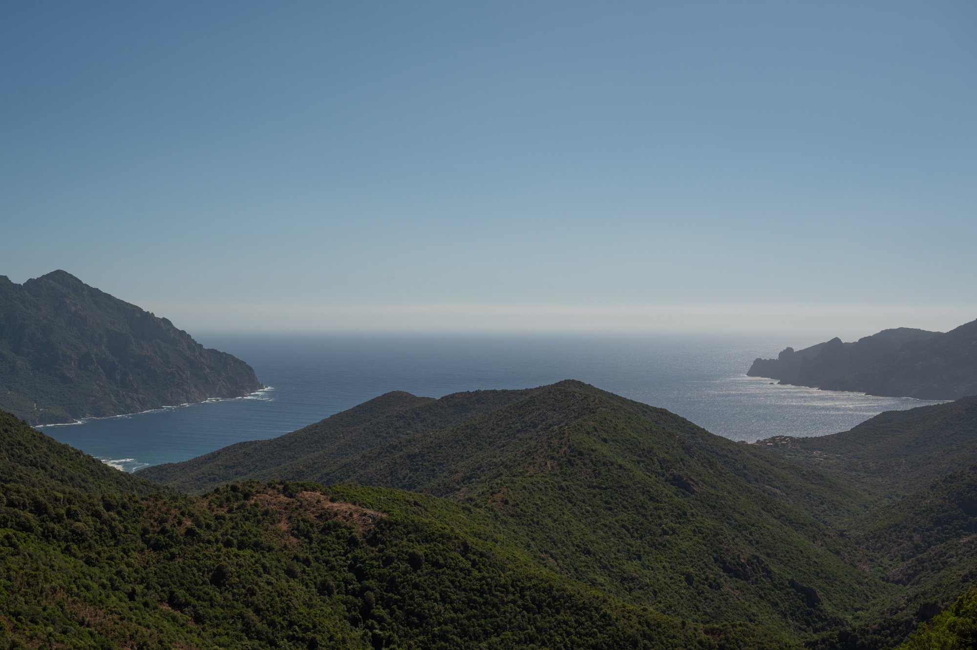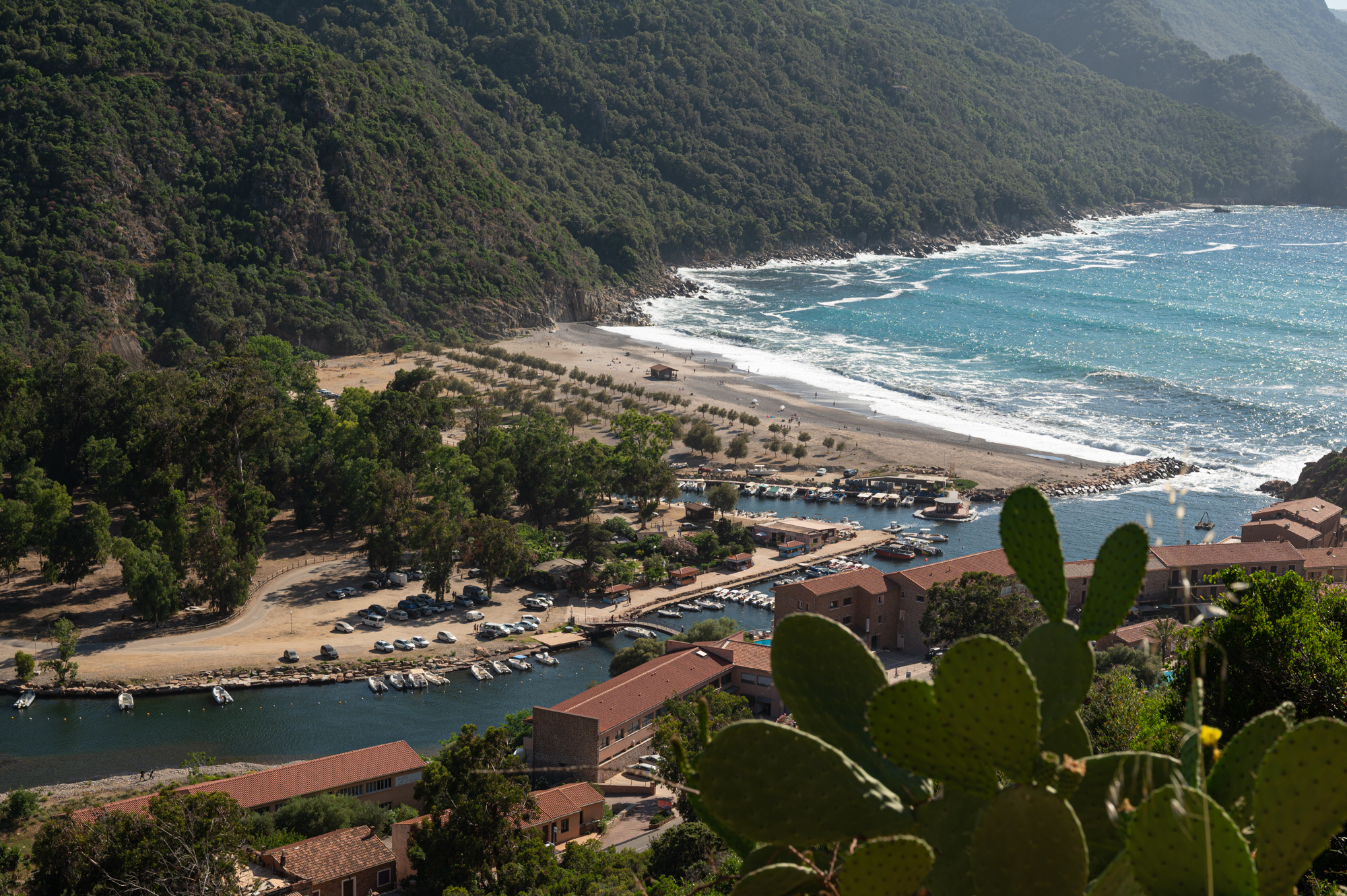 Immer wieder halten wir an und bewundern den sattgrünen Küstenverlauf und das mit dem Himmel verschwimmende Meer. Der Horizont ist eher eine verschwommene Fläche als eine scharfe Linie. Die Straßen sind hier nicht mehr so großzügig bemessen wie weiter im Inland. Sie sind wieder eng und kurvig. Der Verkehr wird immer mehr, als wir Örtchen mit den wohlklingenden Namen wie Osani, Partinello oder Serriera passieren. Wie die Kuh am Fluss, also wortwörtlich aus dem Nichts, tut sich rechts unter uns der Blick auf ein Städtchen am Meer auf. Kurz darauf eine Haltebucht. Als ich den Motor ausschalte, höre ich die Wellen. Sie kommen in viel größeren Abständen als wir es hier bisher kennen. Sie haben einen kräftigen, dumpfen Klang. Das Schild an der Haltebucht kündigt an: "Bienvenue à Porto Ota". Der Ort, an dessen Strand die kräftigen Wellen auslaufen, das ist unsere neue Basis. Und der erste Eindruck ist malerisch.