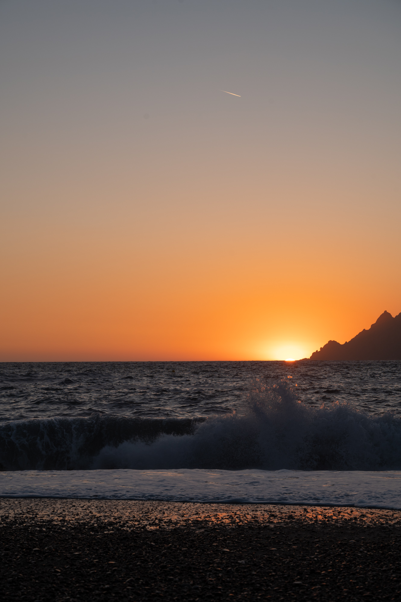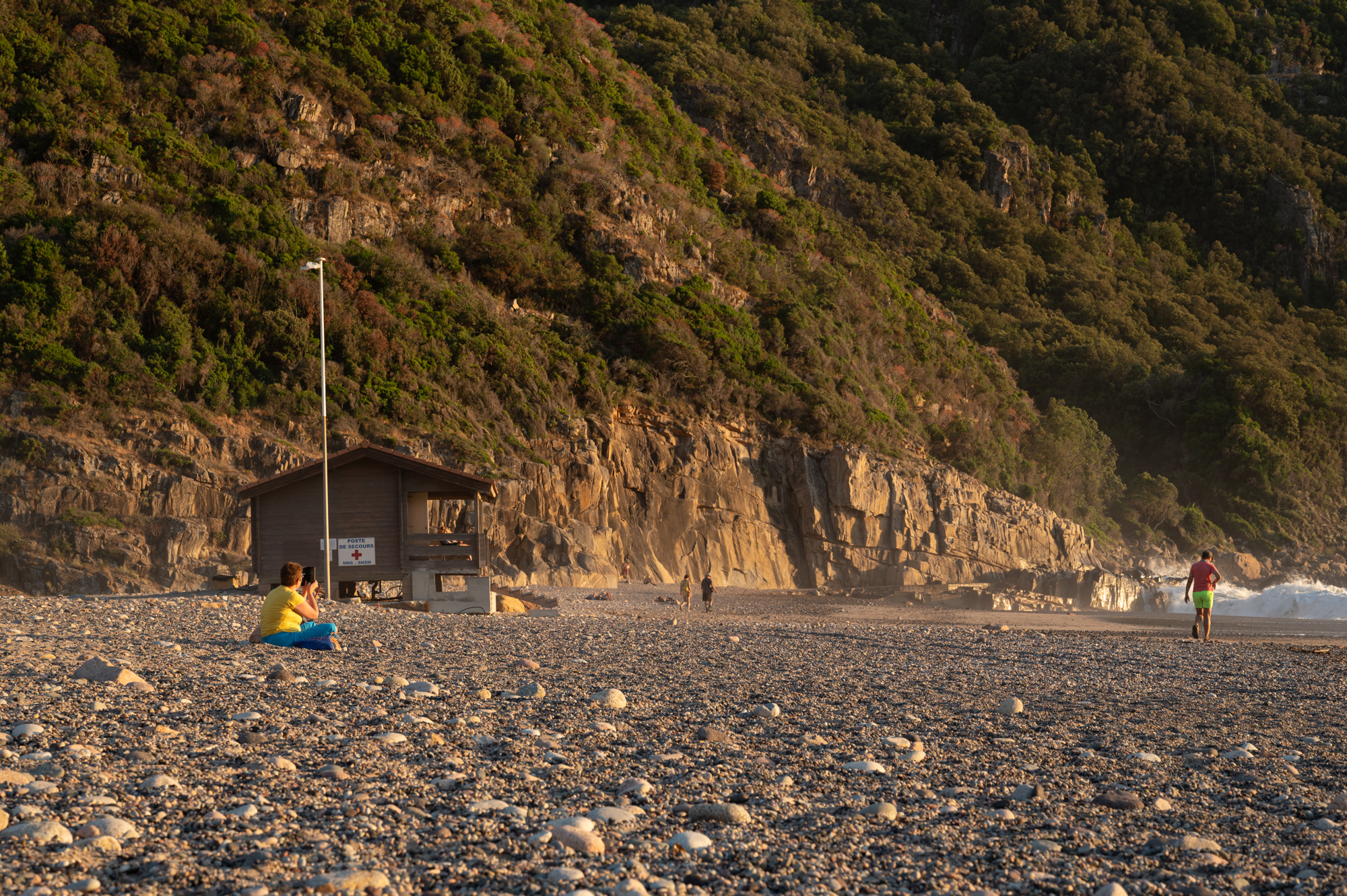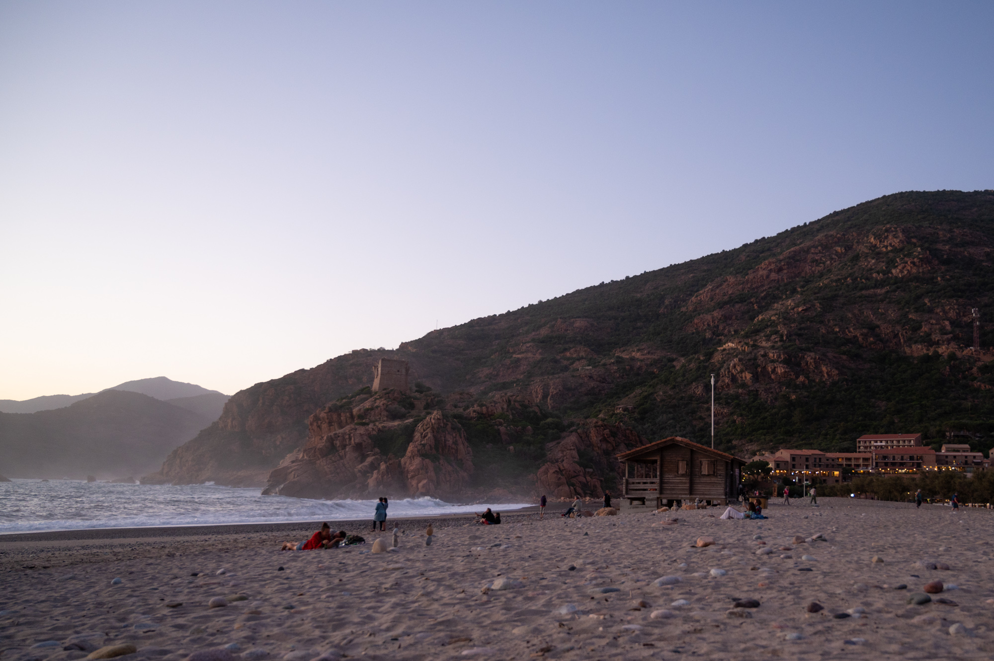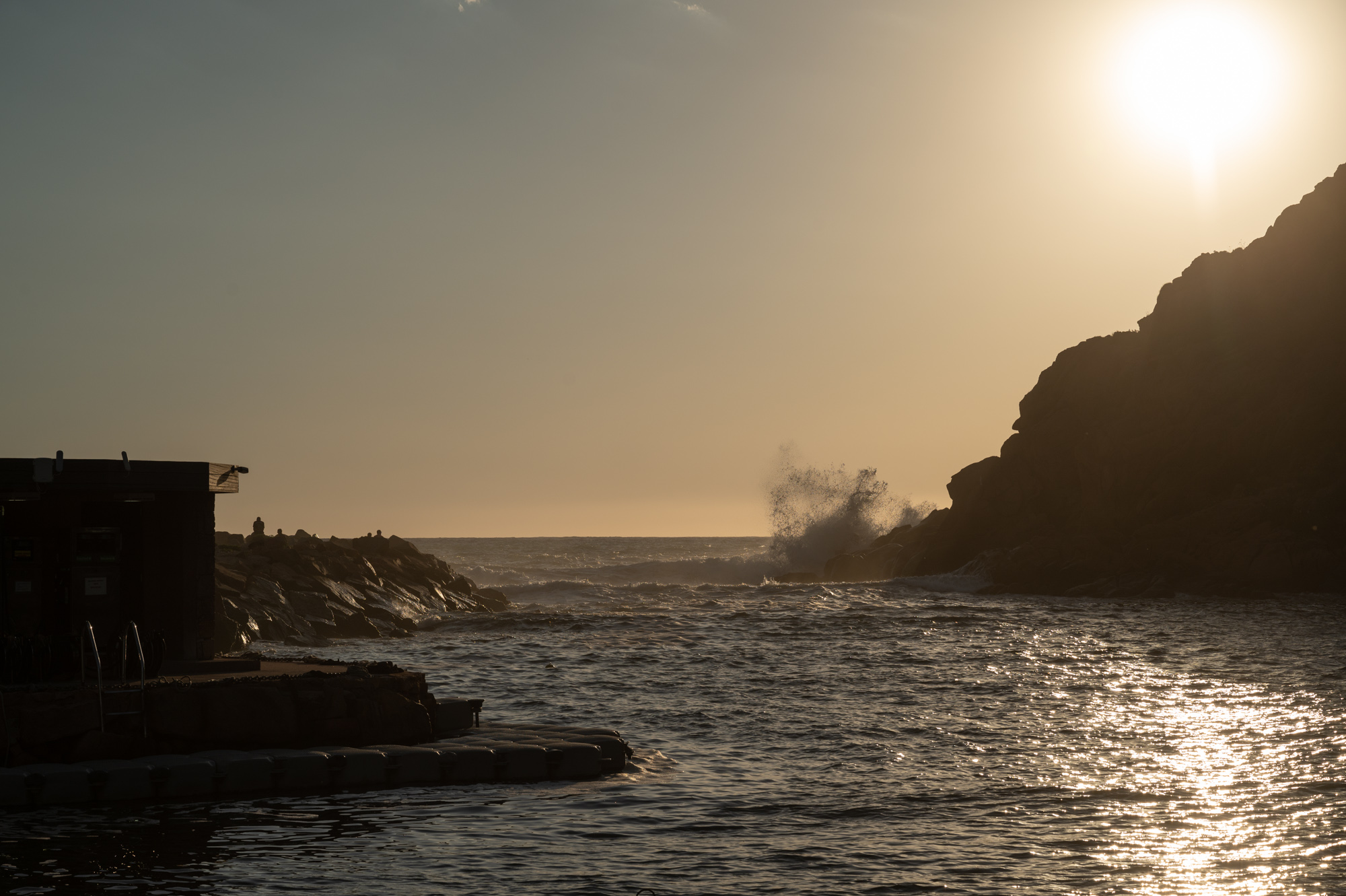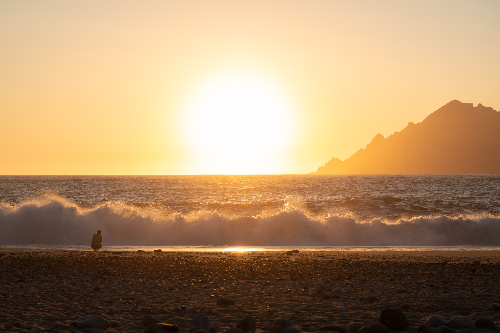 Den ganzen Abend lang schauen wir der Sonne langsam beim Sinken zu, verdauen die Eindrücke des heutigen Tages. Den Wein trinken wir aus Pappbechern aus dem Hotel. Wir schauen dabei zu, wie sich einzelne Wellen zu größeren vereinen und dann mit noch größerer Wucht auf den Strand knallen. Wie sich die Kids nebenan immer weiter reinwagen. Auch wir wagen uns immer näher ran und werden von einigen besonders weiten Ausläufern überrascht. Wir schauen dabei zu, wie sich die Farbe des Himmels Minute für Minute ändert und die Umrisse der Halbinsel im Hintergrund immer schärfer und zackiger werden. Als die Sonne dann ganz verschwindet und langsam die blaue Stunde anbricht, bleibt nur noch der Dunst und die Gischt der aufgewühlten See. In der schroffen Landschaft um uns herum dominiert das Rot der schroffen Felsen und das Grün der Vegetation. Wenn das eine Inszenierung war, dann eine ziemlich bombastische. Die Erbauer des Dörfchens wollten da wahrscheinlich einfach nur mithalten. Es ist dunkel, als wir zum Hotel aufbrechen. Die Restaurants sind schon lange leer und geschlossen. Die einzigen, die noch unterwegs sind, sind die Zuschauer des Schauspiels, die das Finale so lange wie möglich herausgezögert haben. Darunter sind auch wir.