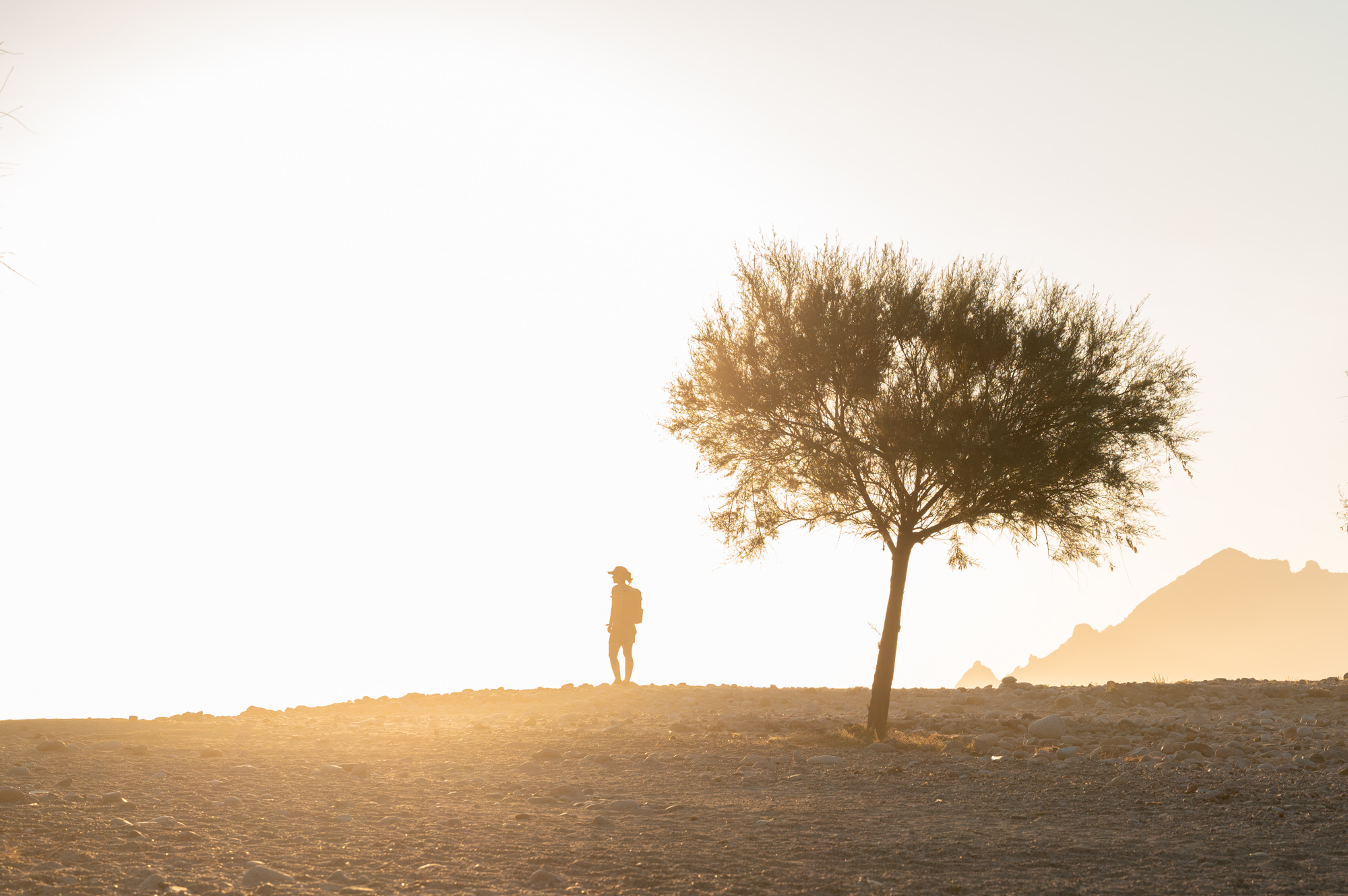 Spätestens hier aber überwältigt uns die Lichtstimmung des mittlerweile eingebrochenen Abends. Wir durchqueren den oberen, mit Bäumen bepflanzten Teil des Strandes. In der Luft hängt der Dunst und die Gischt des aufgewirbelten Wassers. Im Gegenlicht der Sonne wirkt alles eher wie eine verträumte Wüstenszene, wie eine Wanderung in den Abend hinein, die gerade erst begonnen hat. Und das, obwohl einige Meter vor uns die Wellen bereits zu hören, aber noch nicht zu sehen sind.
