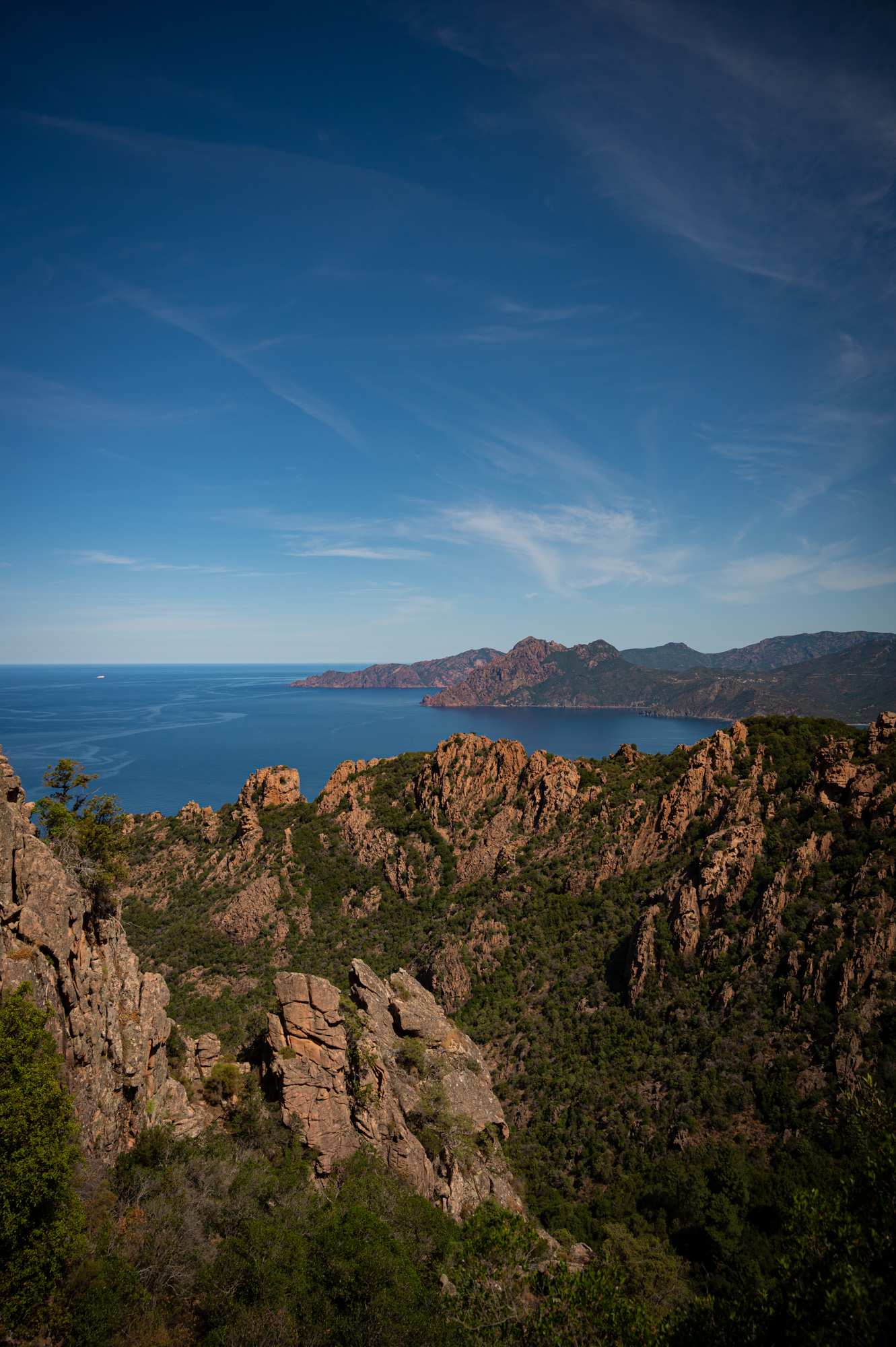Mit Premiumfrühstück im Bauch schlängeln wir uns die Straße hoch in Richtung Piana. Die Reisebusse, wie auch immer sie es schaffen, sich hier hochzuschlängeln, laden ihre Gäste an den Calanches ab. Es ist wuselig auf der Straße. Es scheint ein kurzer Stopp zu sein. Bemüht darum, die abgelenkten Touristen im Blick zu behalten, passieren wir im Schritttempo die Wuselstelle und schlängeln uns weiter. Kurz dahinter begrüßt uns wieder das liebliche Stadtbild Pianas. Wir fahren zweimal durch den Ort und finden keinen Parkplatz. Auf einem kleinen unbefestigten Parkplatz außerhalb der Stadt blicken wir über die Westküste und den Golf von Porto in Richtung Norden. Kurz innegehalten wäre es doch schön, mal etwas komplett Ungeplantes zu machen. Einen Ort zu besuchen, den wir nun gar nicht auf dem Schirm hatten. Piana, wir werden sicherlich in Zukunft das Vergnügen miteinander haben. Bis dahin müssen wir uns ein wenig gedulden.