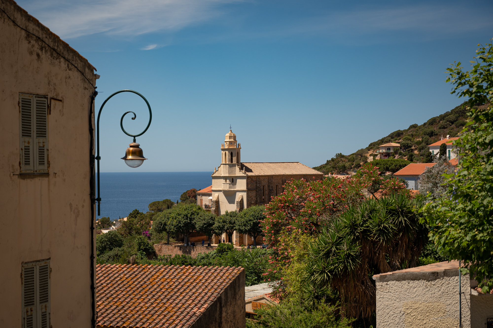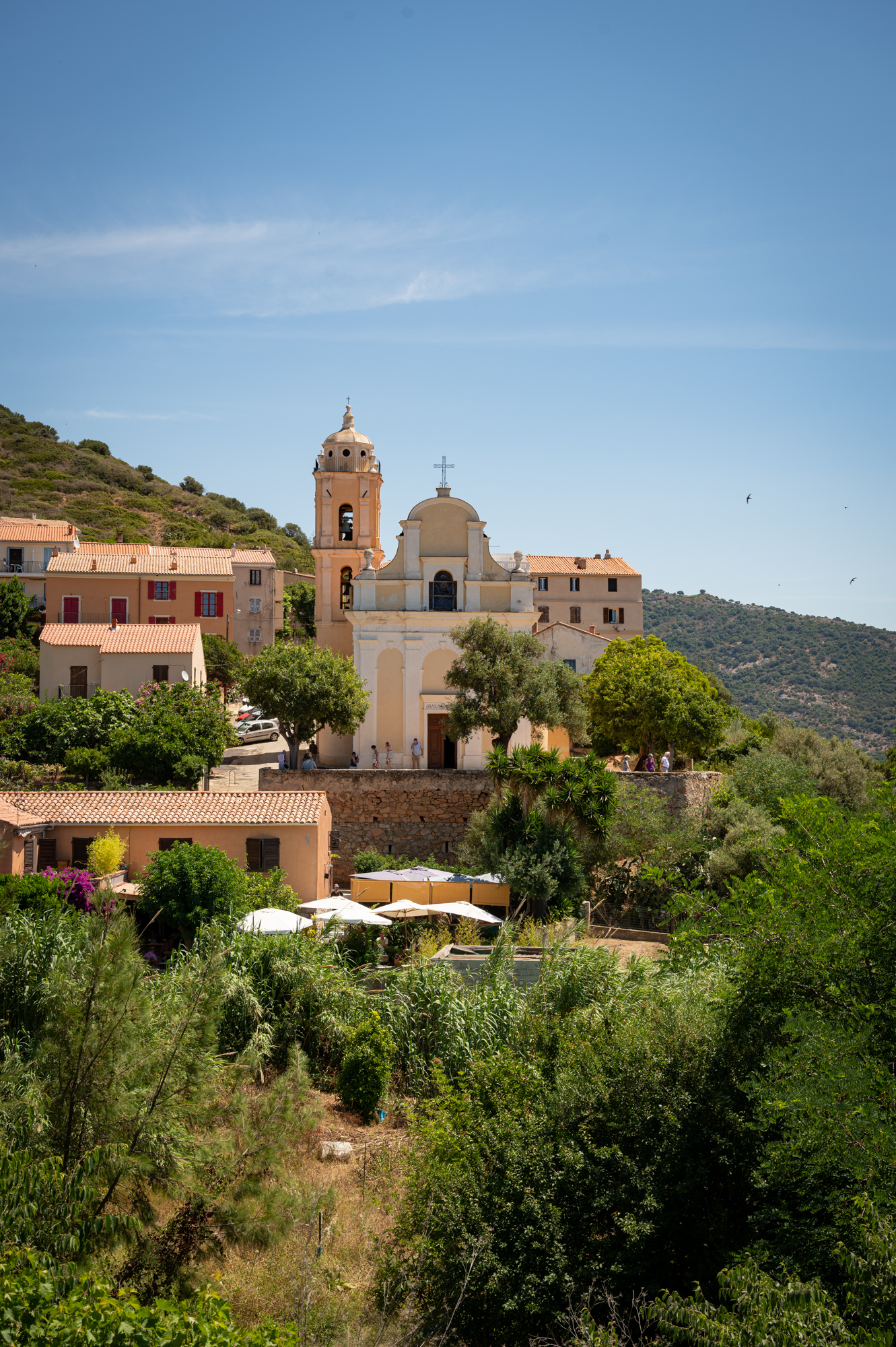 Heute gehört Korsika immer noch zu Frankreich. Doch das Spannungsverhältnis ist deutlich sichtbar geblieben. Sowohl französische als auch korsische Identität werden hier nebeneinander gepflegt, etwa durch die weitestgehend zweisprachigen Straßenschilder. Regional scheint es aber durchaus üblich, seinen Unmut über das Französische kundzutun. Etwa, indem die französischen Ortsnamen auf eben jenen Straßenschildern mit Kugeln bis zur Unleserlichkeit durchsiebt werden. Das pazifistischere Pendant dazu besteht darin, die Ortsnamen ganz einfach zu übermalen. Auf unserer bisherigen Reise haben wir durchsiebte Straßenschilder in sehr seltenen Fällen gesehen, übermalte schon häufiger. Aber das Spannungsverhältnis suppt immer wieder durch kleine Details - wie eben das Statement "Korsika ist nicht französisch" im Alten Hafen Bastias - ins Bewusstsein. Und auch, wenn die vorhin erwähnte Flagge generell allgegenwärtig ist, hier in Cargèse ist sie "allgegenwärtiger". Es entsteht der Eindruck, als würde sich hier auf eine komische Weise jeder einzelne korsische Gegensatz versammeln. Ohne, dass man es wirklich beschreiben kann.