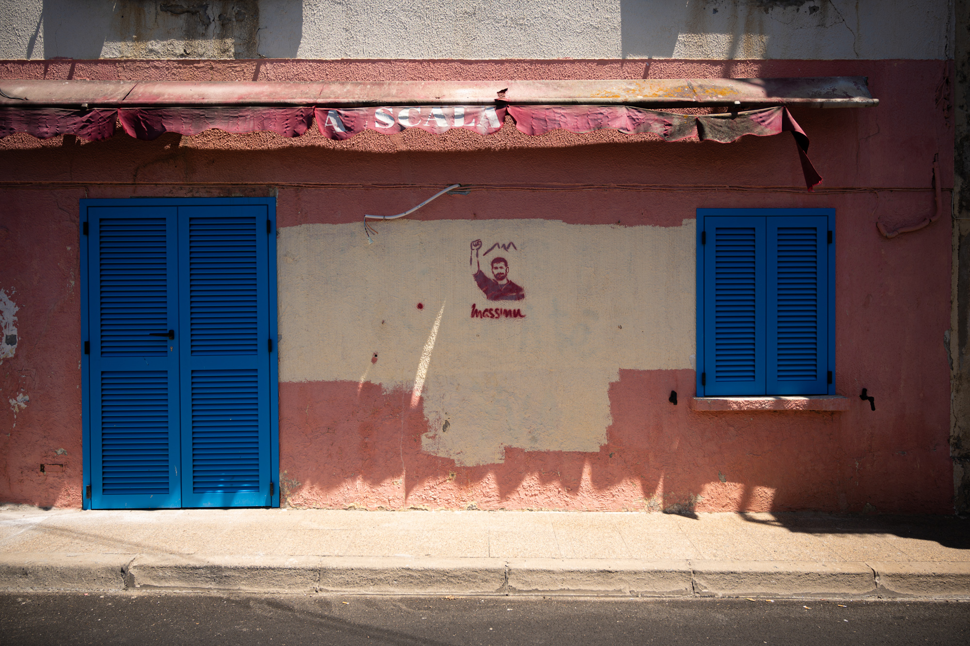 Während wir gemütlich an einem der wahrscheinlich schönsten Orte in Cargèse bei Galette und Eis sitzen und uns über die Auffälligkeiten der Stadt unterhalten, versucht Teresa etwas über die Graffiti herauszufinden, die an praktisch jeder Hauswand aufgesprüht sind. Auch dieses Detail ist uns bereits in Bastia aufgefallen, wenn auch nicht mit der Häufung, wie wir es in Cargèse erleben. Das Graffiti zeigt einen bärtigen jungen Mann, der seine Hand zur Faust ballt und sie kämpferisch in die Höhe streckt. Sein Gesichtsausdruck ist dagegen eher zuversichtlich als kämpferisch. Im Hintergrund befinden sich stilisierte Berge, im Vordergrund der einprägsame Name Massimu.