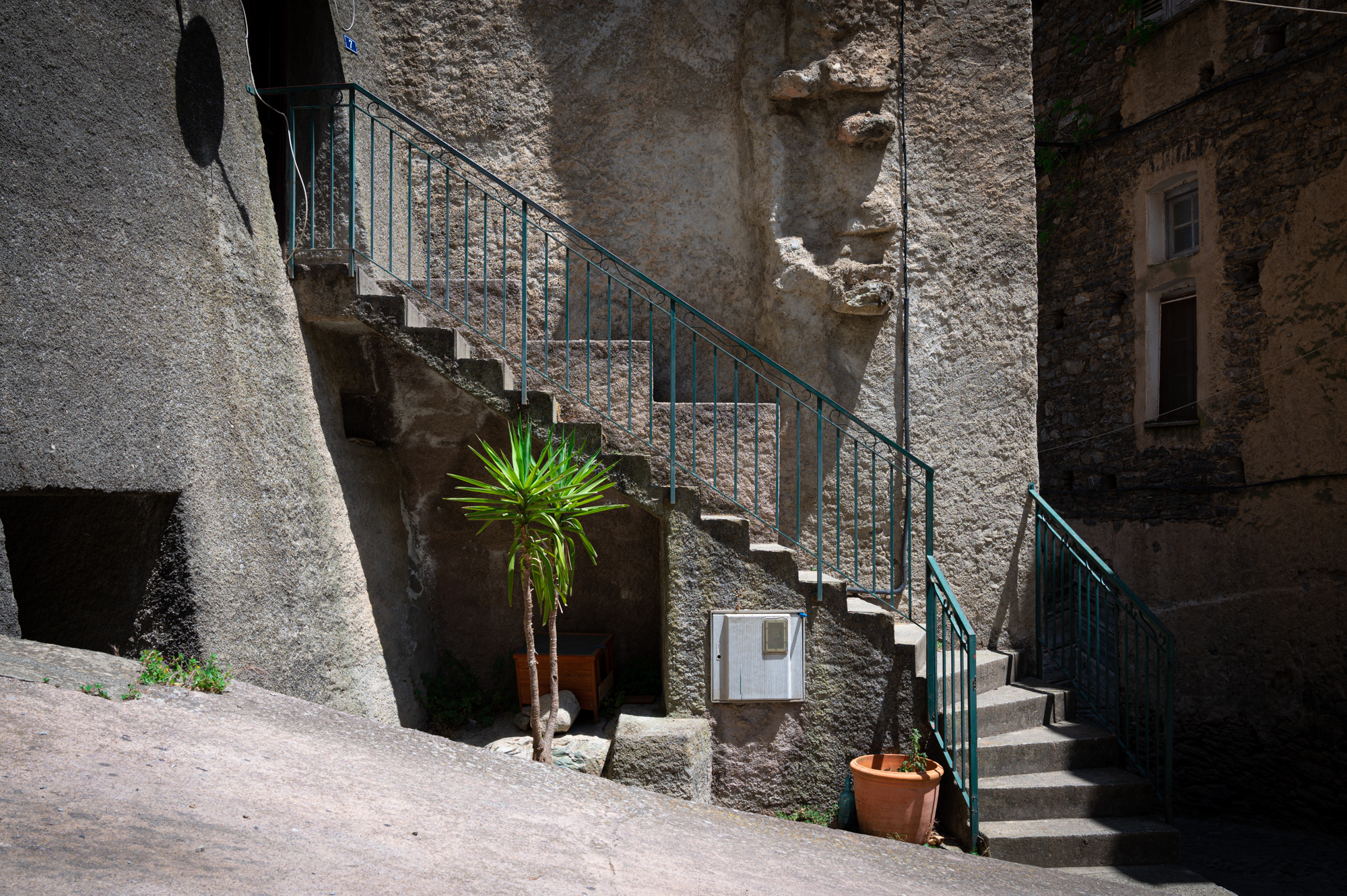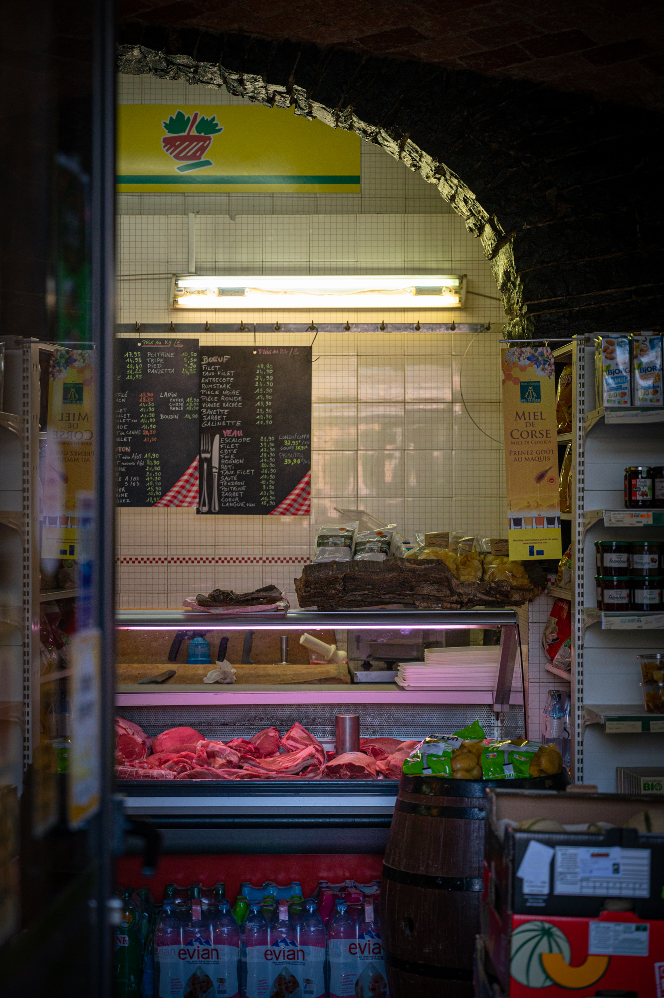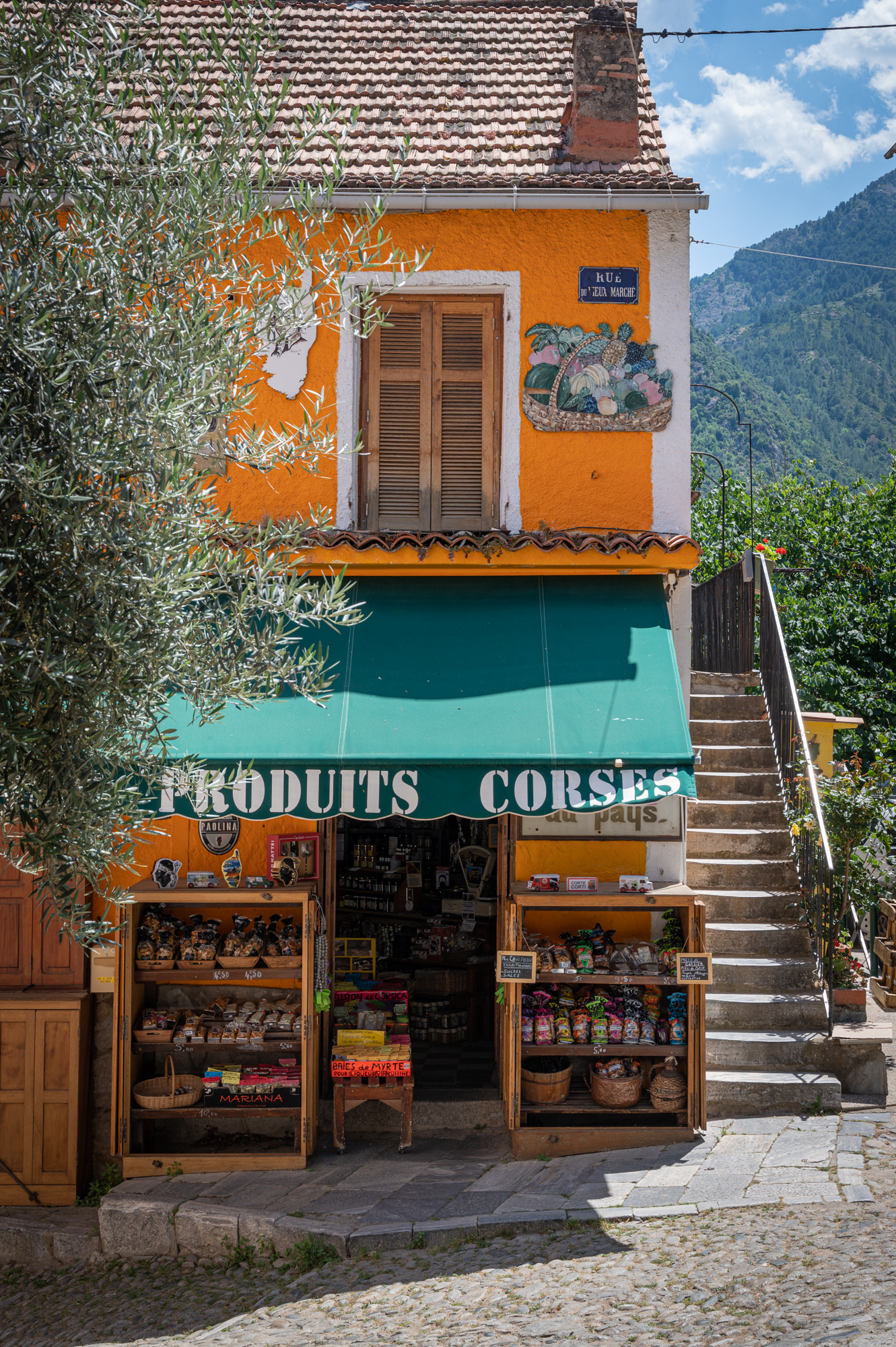 Ziel- und planlos, wie wir das manchmal gerne machen, geben wir uns weiter dem Zufall hin. Wir wandern einfach so durch die zahllosen, engen Gassen Cortes und saugen die Eindrücke in der gleißenden Nachmittagssonne auf. Die vormittägliche Geschäftigkeit der einzigen bedeutenden Stadt Zentralkorsikas ist ein kleines bisschen einer siestaähnlichen Trägheit gewichen. Corte ist, mehr noch, als die anderen Orte, die wir bisher gesehen haben, ein Ort des Schattenspiels. Wenn man sich darauf einlässt, versprüht die Altstadt eine warme Melancholie. Das Einheitsgrau der historischen Fassaden wird von zahlreichen Farbsprenkeln aufgelockert. So etwa auch durch das Gebäude, in dem sich der kleine Laden von Jean Marie Ghionga befindet: Es ist in knalligem Orange gestrichen, die Markise ist dunkelgrün und trägt die Aufschrift "Produits Corses" - ein echter Hingucker und bei einem Altstadtspaziergang absolut nicht zu verfehlen. Seine Geschichte geht zurück auf das Jahr 1769. Damit ist der Farbsprenkel einer der ältesten Einkaufsläden Europas. Welch Wunder, auch hier wieder die magische Jahreszahl, die mit Corte und Korsika unauflöslich verbandelt ist.