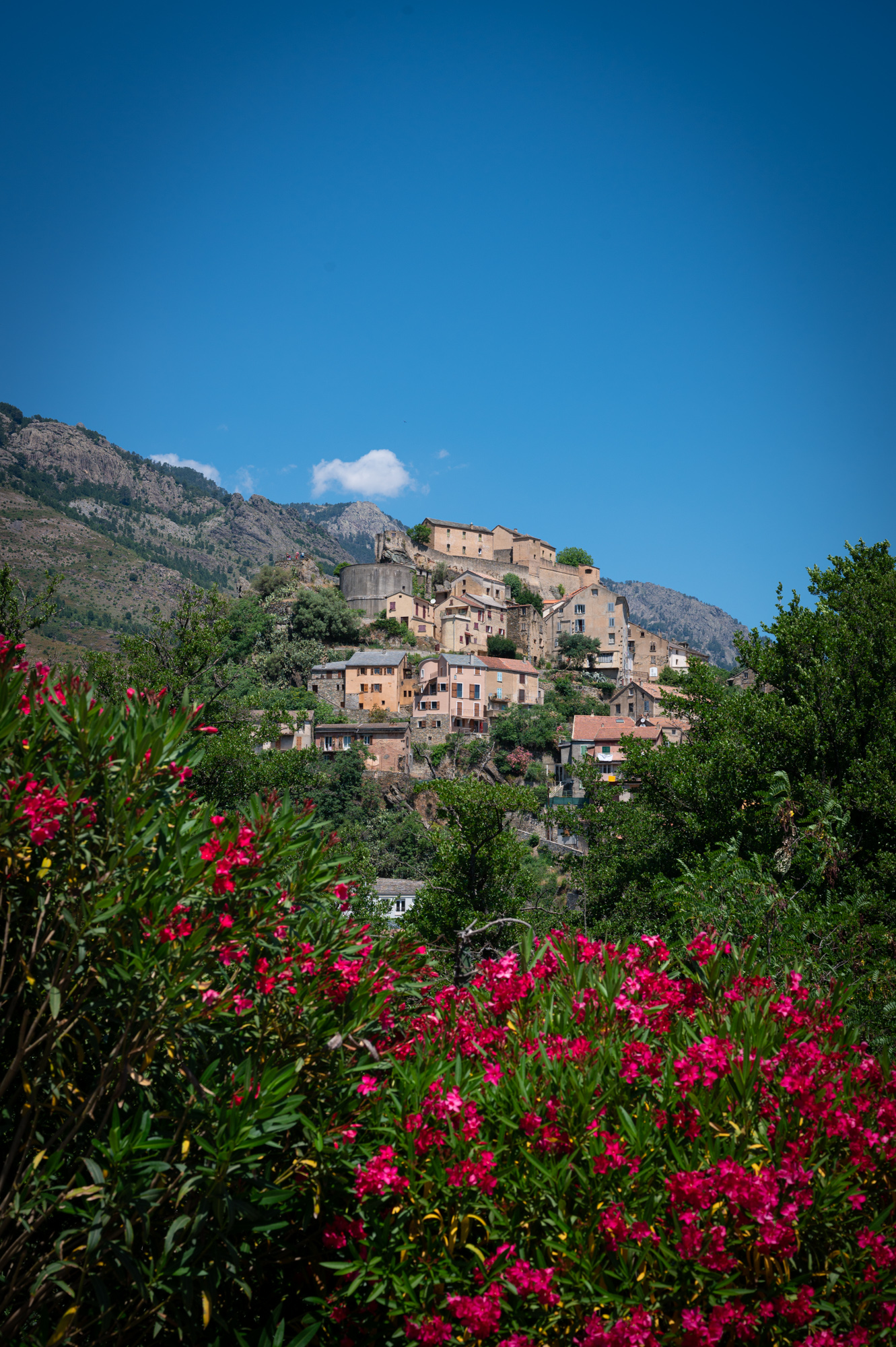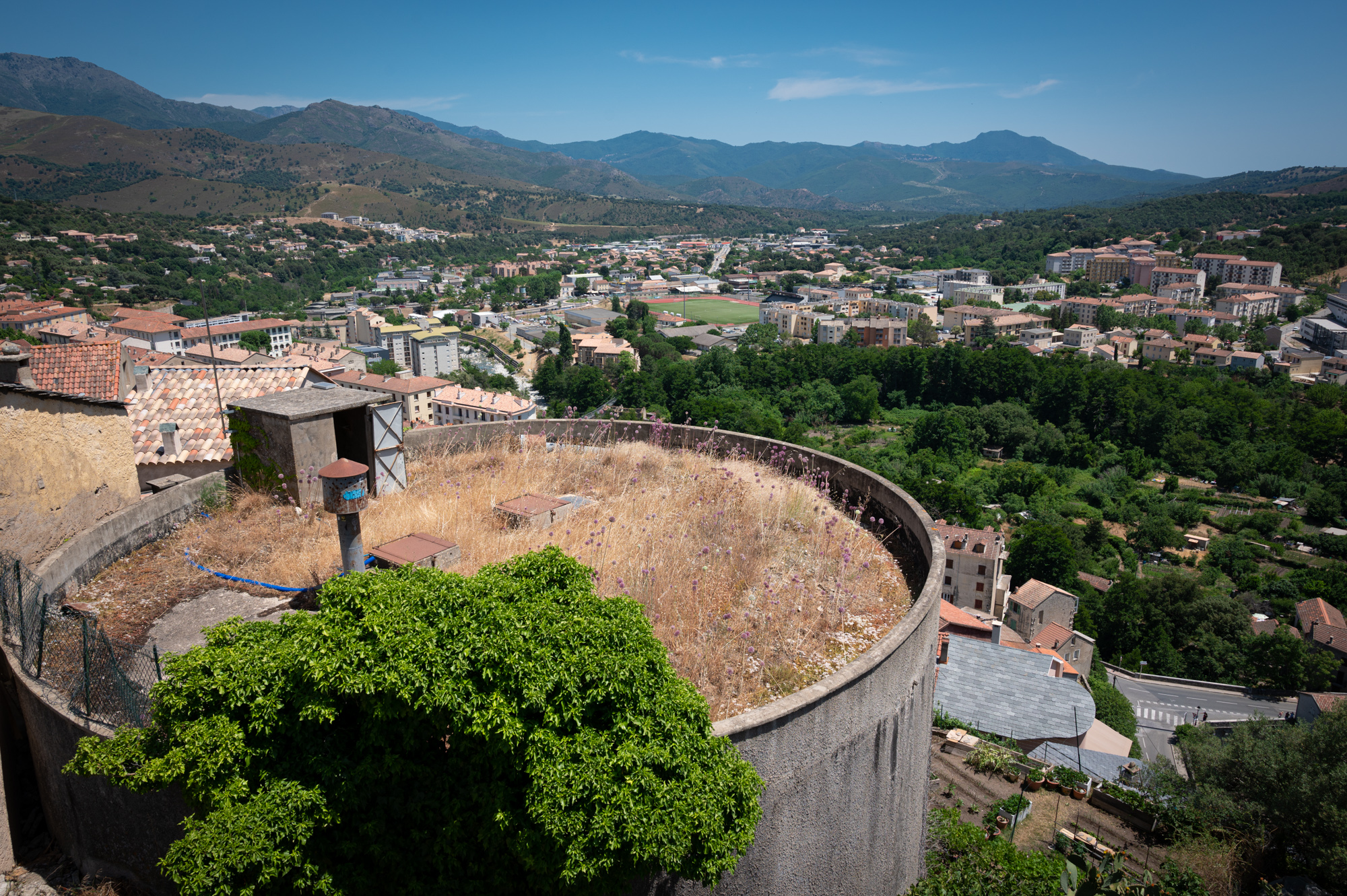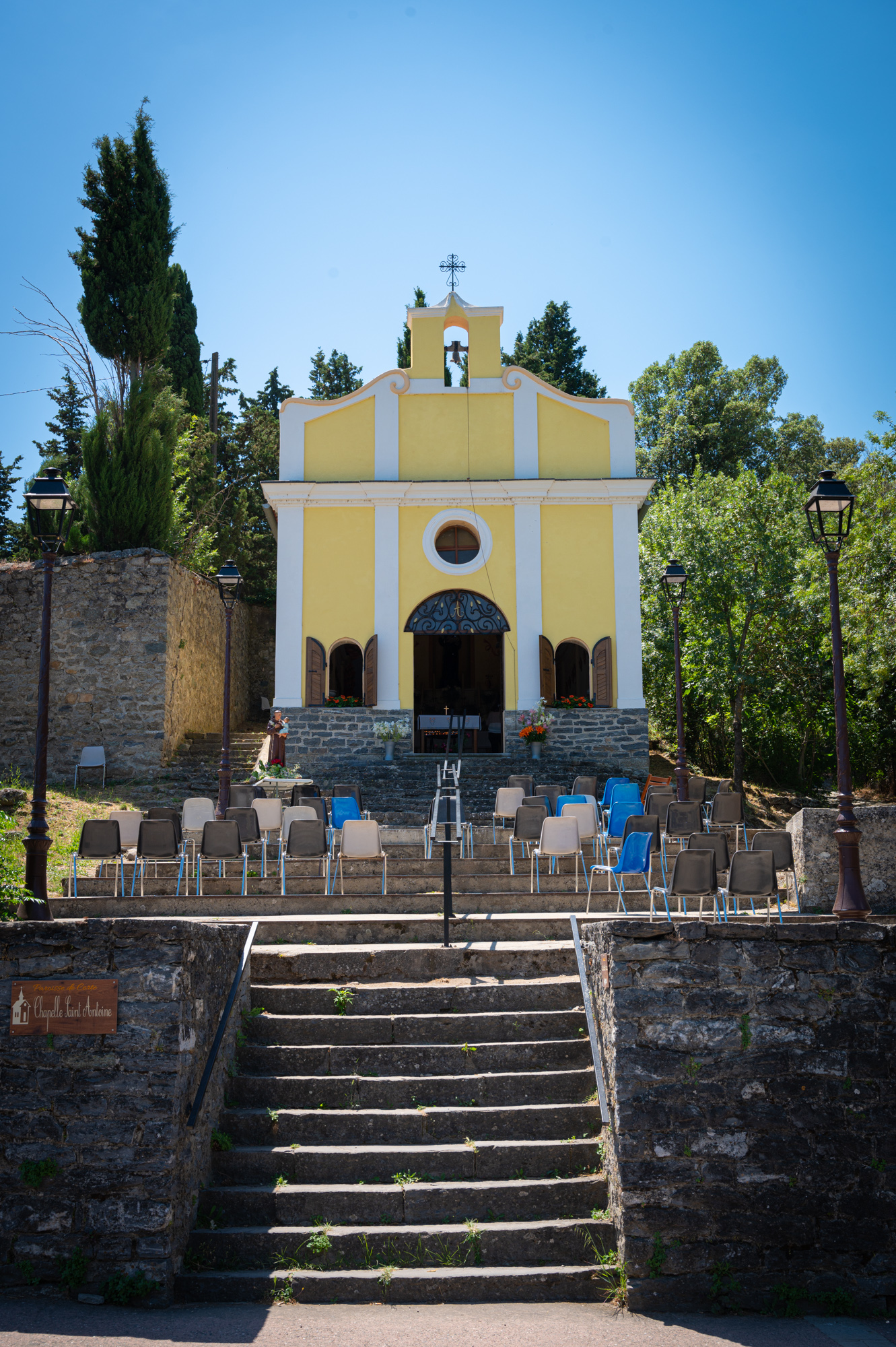Das Ende der Brücke verliert sich irgendwo im Dickicht. Dort winden sich einige Treppenstufen herauf auf die Ebene einer verkehrsberuhigten Straße. Linkerhand eine Grundschule, vor der junge Eltern Schlange stehen, um ganz offensichtlich ihre Kinder abzuliefern. Eine uns ungewöhnlich erscheinende Uhrzeit. Beginnt jetzt erst die Schule oder wird hier im Schichtbetrieb unterrichtet? Wir verstehen nicht ganz. Die Wohnanlage vor uns besteht aus schlichten Plattenbauten mit betont geschlossenen Balkons. Wir biegen rechts ab in die Avenue 9 Septembre und laufen direkt auf ein pompöses Universitätsgebäude zu. Schon von weitem begrüßen uns die weißen Lettern auf schwarzem Grund: "Università di Corsica Pasquale Paoli - Campus Grimaldi". Wie es wohl ist, Student auf Korsika zu sein? Mir ist noch nie eine Veröffentlichung dieser Uni begegnet. Das mag aber auch an den Fachbereichen liegen. Corte ist die einzige korsische Universitätsstadt. Es gibt einige Außenstellen und Forschungsinstitute in Bastia, Ajaccio oder etwa Cargèse (wo wir ja gestern waren), aber das korsische Studentenleben spielt sich im Semester wohl hier ab. Und, wie ich finde, spürt man das irgendwie auch abseits des Campusviertels, in dem wir uns gerade befinden. Viel erfährt man nicht über diese Uni: Sie ist mit 4700 Studierenden recht klein und existiert in der Form seit 1981, sieht sich aber in der Tradition der ersten korsischen Universität. Deren Bestehen währte auch nicht lange, nämlich von 1765 bis 1769. Bis zu dem Jahr also, in dem Korsika seine Unabhängigkeit verlor und in französische Herrschaft überging. Trotz seines weltoffenen Images, das sich die Universität zu geben versucht, ist ihre Auferstehungsgeschichte umstritten: Nationalismus hier, Nationalismus da. Hach, Korsika, du machst es einem nicht einfach, deine Geschichte zu begreifen. Einige Schritte hinter dem Grimaldicampus gehen wir wieder auf eine Brücke zu. Sie führt über den Restonica. Kurz davor eine kleine Kapelle: die Chapelle Saint Antoine. Davor sind Stühle aufgestellt, scheinbar in Vorbereitung auf einen Gottesdienst. Die Fassade der Kapelle ist gelb und weiß gehalten, davor steht eine Statue eines Mönches mit Kind auf dem Arm. Dreht man sich in die entgegengesetzte Richtung, hat man durch ein Meer blühender Blumen und Sträucher hindurch einen Blick auf die Zitadelle: Häuser, die wie aufeinandergestapelt wirken.
