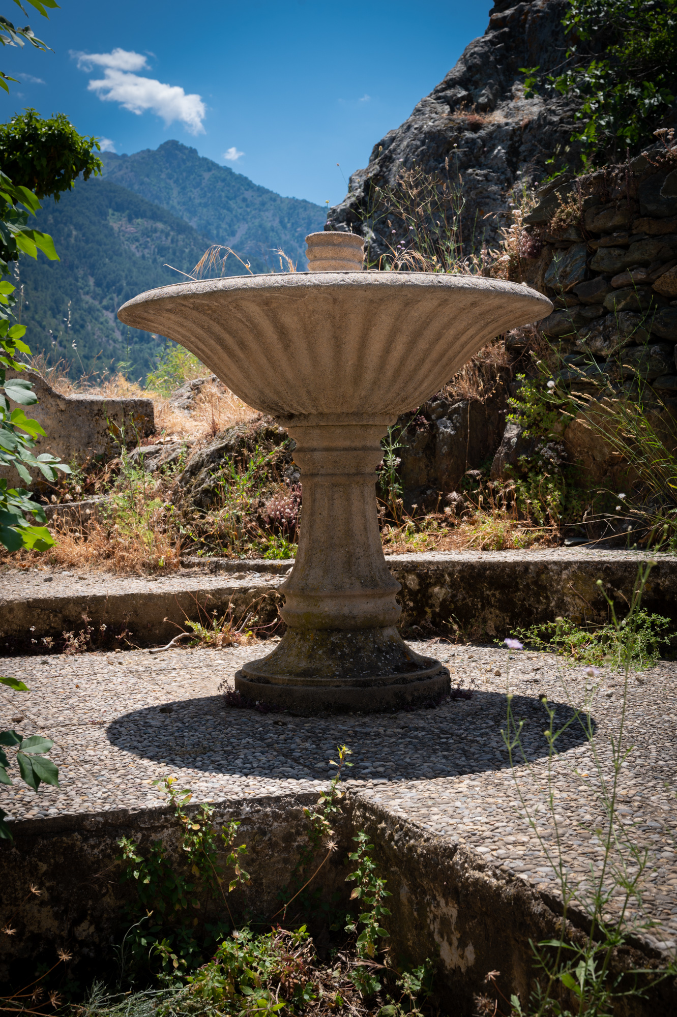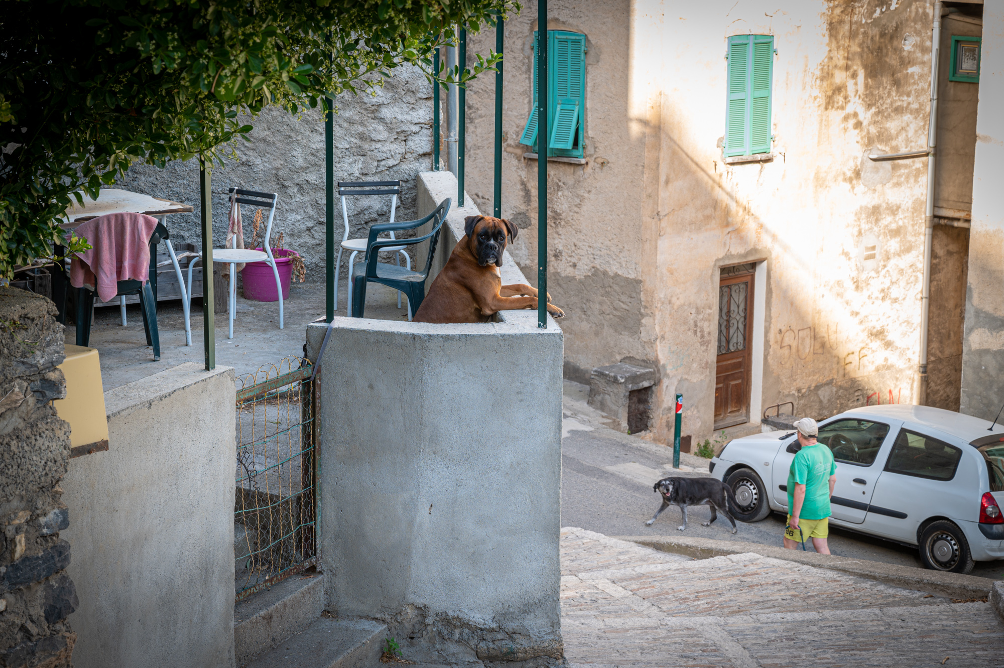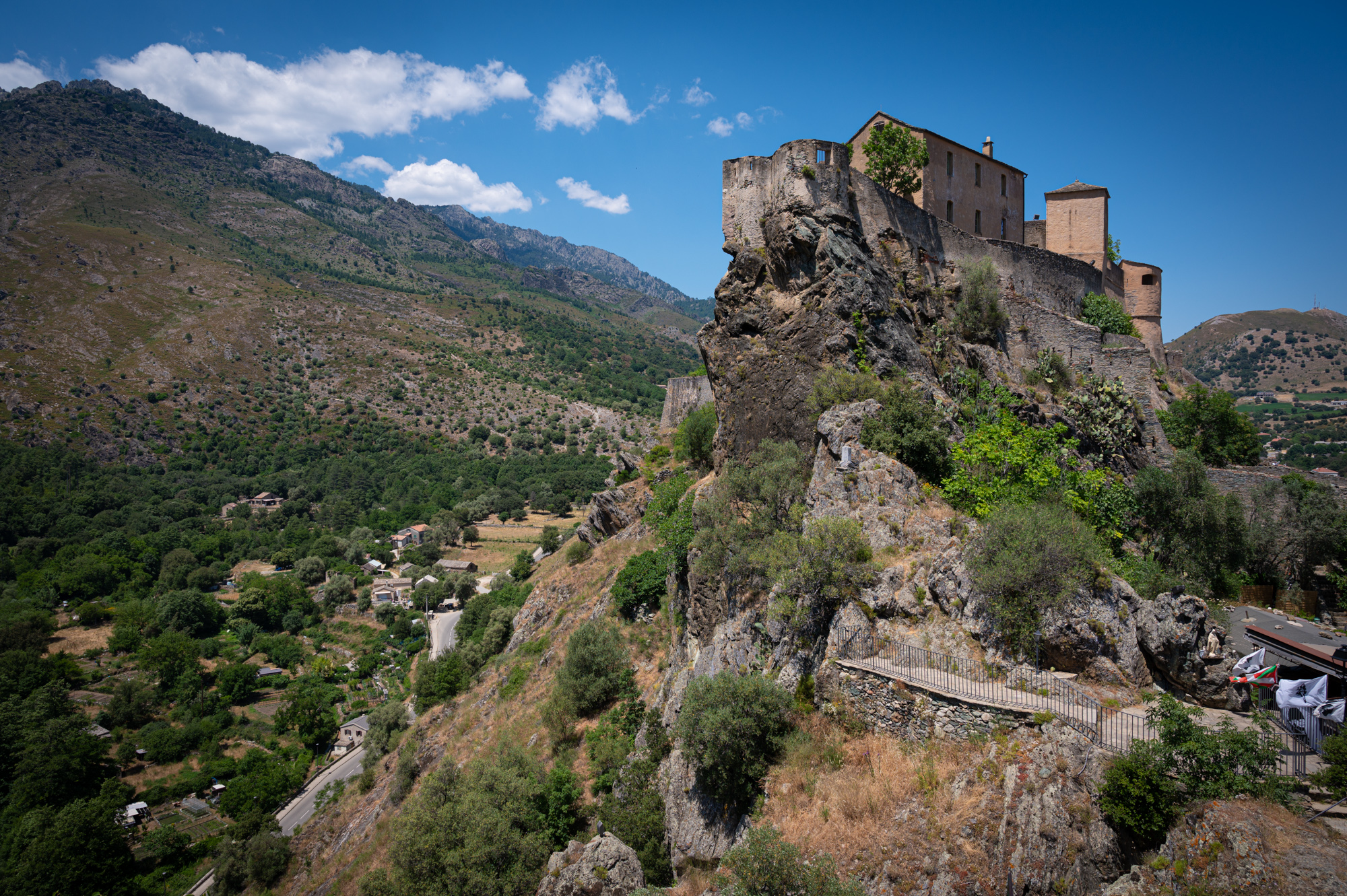 Das Ende der Brücke verliert sich irgendwo im Dickicht. Dort winden sich einige Treppenstufen herauf auf die Ebene einer verkehrsberuhigten Straße. Linkerhand eine Grundschule, vor der junge Eltern Schlange stehen, um ganz offensichtlich ihre Kinder abzuliefern. Eine uns ungewöhnlich erscheinende Uhrzeit. Beginnt jetzt erst die Schule oder wird hier im Schichtbetrieb unterrichtet? Wir verstehen nicht ganz. Die Wohnanlage vor uns besteht aus schlichten Plattenbauten mit betont geschlossenen Balkons. Wir biegen rechts ab in die Avenue 9 Septembre und laufen direkt auf ein pompöses Universitätsgebäude zu. Schon von weitem begrüßen uns die weißen Lettern auf schwarzem Grund: "Università di Corsica Pasquale Paoli - Campus Grimaldi". Wie es wohl ist, Student auf Korsika zu sein? Mir ist noch nie eine Veröffentlichung dieser Uni begegnet. Das mag aber auch an den Fachbereichen liegen. Corte ist die einzige korsische Universitätsstadt. Es gibt einige Außenstellen und Forschungsinstitute in Bastia, Ajaccio oder etwa Cargèse (wo wir ja gestern waren), aber das korsische Studentenleben spielt sich im Semester wohl hier ab. Und, wie ich finde, spürt man das irgendwie auch abseits des Campusviertels, in dem wir uns gerade befinden. Viel erfährt man nicht über diese Uni: Sie ist mit 4700 Studierenden recht klein und existiert in der Form seit 1981, sieht sich aber in der Tradition der ersten korsischen Universität. Deren Bestehen währte auch nicht lange, nämlich von 1765 bis 1769. Bis zu dem Jahr also, in dem Korsika seine Unabhängigkeit verlor und in französische Herrschaft überging. Trotz seines weltoffenen Images, das sich die Universität zu geben versucht, ist ihre Auferstehungsgeschichte umstritten: Nationalismus hier, Nationalismus da. Hach, Korsika, du machst es einem nicht einfach, deine Geschichte zu begreifen. Einige Schritte hinter dem Grimaldicampus gehen wir wieder auf eine Brücke zu. Sie führt über den Restonica. Kurz davor eine kleine Kapelle: die Chapelle Saint Antoine. Davor sind Stühle aufgestellt, scheinbar in Vorbereitung auf einen Gottesdienst. Die Fassade der Kapelle ist gelb und weiß gehalten, davor steht eine Statue eines Mönches mit Kind auf dem Arm. Dreht man sich in die entgegengesetzte Richtung, hat man durch ein Meer blühender Blumen und Sträucher hindurch einen Blick auf die Zitadelle: Häuser, die wie aufeinandergestapelt wirken.
