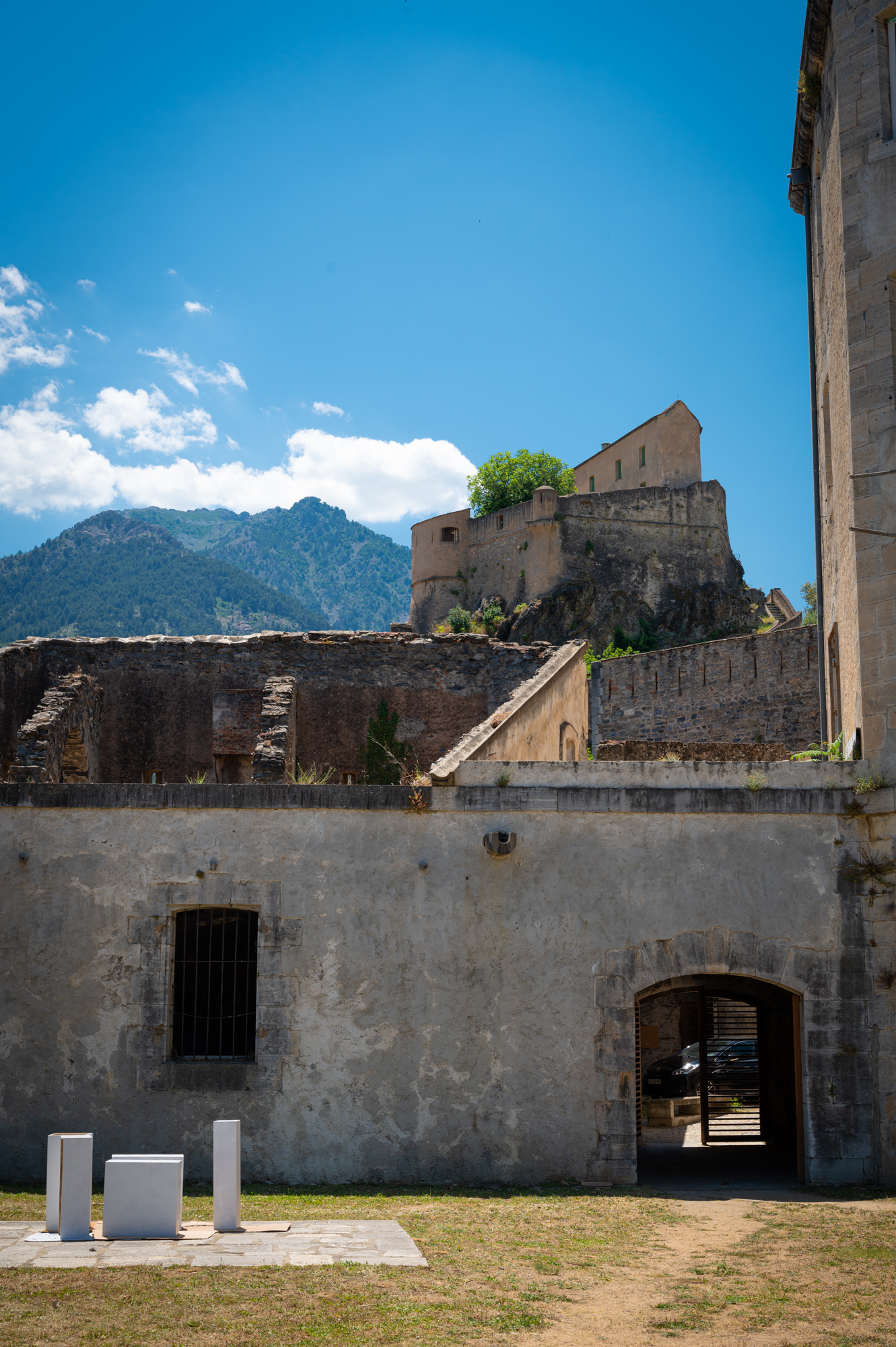 Wir brechen gleich zu Beginn des Tages mit der Definition eines gemütlichen Tages. Aber nur kurz! Wir möchten die Knutschkugel und uns aus den undurchsichtigen Fängen des Tuffelli'schen Viertelstundentaktes befreien. Es ist Montag. Gestern parkten wir erwartungsgemäß gratis und der Wochentarif setzte dann gleich um 0 Uhr ein. Als wir am Parkautomaten stehen - es ist kurz nach zehn - haben wir bereits knapp neun Euro zu zahlen. Der Viertelstundentakt ist im Sommer gestaffelt von 50 Cent über 30 Cent bis schließlich 20 Cent je Viertelstunde ab Stunde vier. In unmittelbarer Nähe befinden sich zahlreiche Gratisparkplätze. Sie gehören zum Mariani-Campus der Universität von Corte. Trotz der universitären Zugehörigkeit ist uns gestern bei den Recherchen nichts aufgefallen, was dagegen spräche dort zu parken. Wenn auch nicht explizit von der Beschreibung der Unterkunft erwähnt: Das muss die kostenlose Parkmöglichkeit sein, die zur Unterkunft "dazugehört". Die Beschreibung war - wohlwollend ausgedrückt - etwas missverständlich formuliert. Wir fahren also um zwei Ecken ein Stück aus der Altstadt heraus und steuern auf das Universitätsgelände zu. Das an den Parkplatz angrenzende Gebäude scheint die Mensa zu sein. Wir stellen das Auto in der rechten hinteren Ecke der sonst fast leeren, großen Betonfläche ab. Eine junge Frau übt hier das Mopedfahren. Ein kleiner Teil der trockenen Böschung, an die der Parkplatz angrenzt, scheint erst kürzlich gebrannt zu haben. Wir hoffen auf's Beste. Es führt eine lange, schmale Hängebrücke direkt vom Parkplatz weg. Ein wenig bilde ich mir ein, dass sie wackelig ist. Auf ihr schwebt man über den Ort hinweg, an dem sich die Flüsse Restonica und Tavignano begegnen. Rechterhand, auf der Landzunge, die beide Flüsse zusammenführt, stehen die nackten Grundmauern eines Gebäudes, das ein wenig deplatziert wirkt. Wir wissen nicht, was das mal für ein Gebäude war. Scheinbar wird der Platz aber auch nicht anderweitig gebraucht. Eigentlich wirkt auch die Hängebrücke deplatziert. Sie passt vielmehr in einen Nationalpark oder Baumkronenpfad.