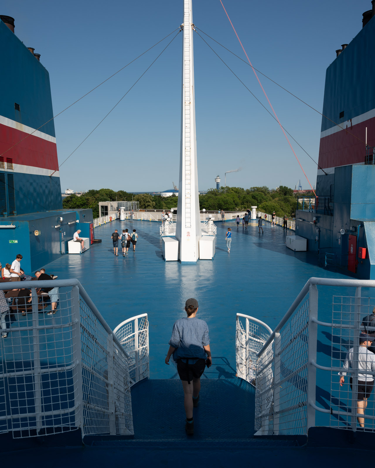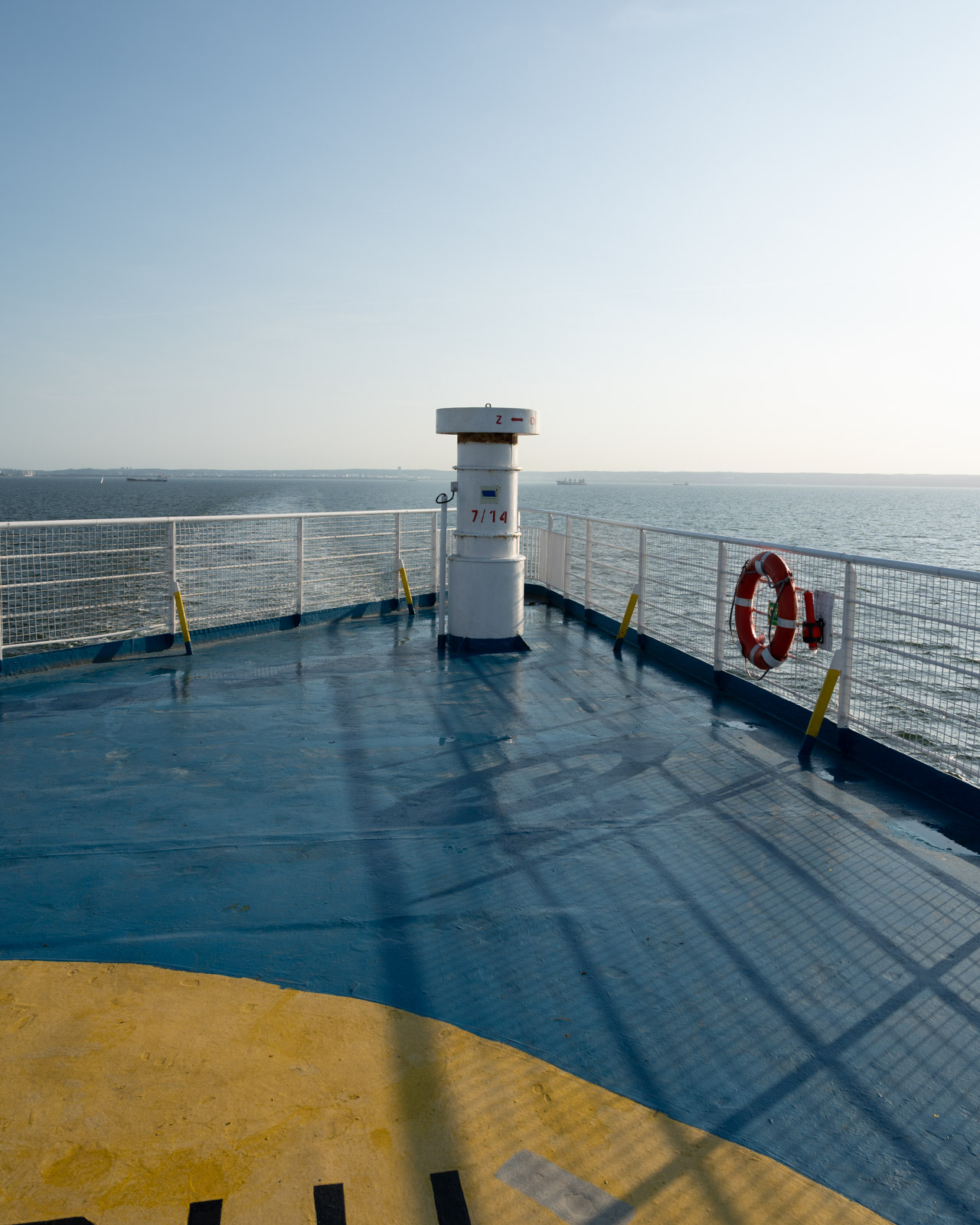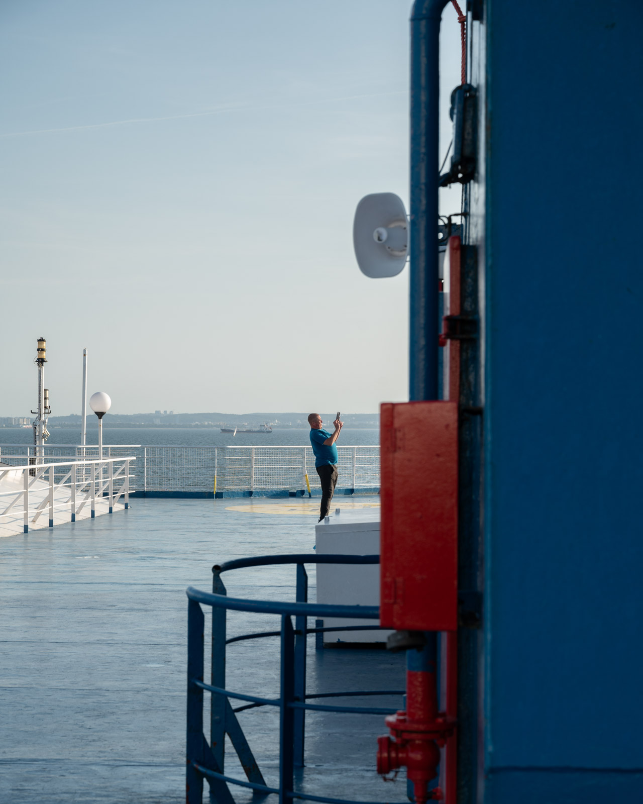 Jede Tür, jedes Objekt aus schwerem Stahl hat scharfe Kanten. Und wenn die Sonne senkrecht steht, entstehen spannende scharfe Kontraste. Auch jetzt haben wir Glück mit dem Wetter. Beim Ablegen der Fähre in Gdańsk weht nur ein schwacher Wind und an Deck ist es warm und sommerlich. Das Festland wirkt diesig und fad, je weiter es sich von uns entfernt. Schiffsdeck, Meer und Himmel gehen Ton in Ton ineinander über.