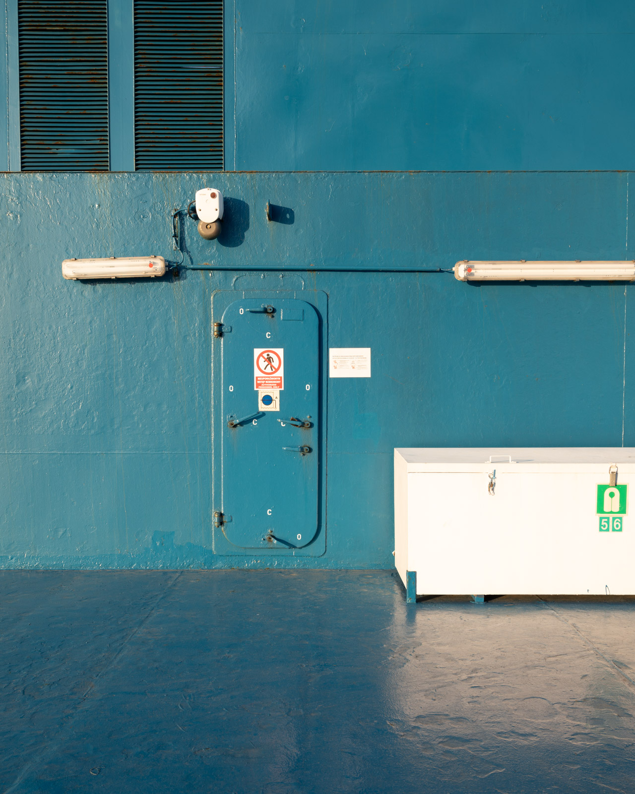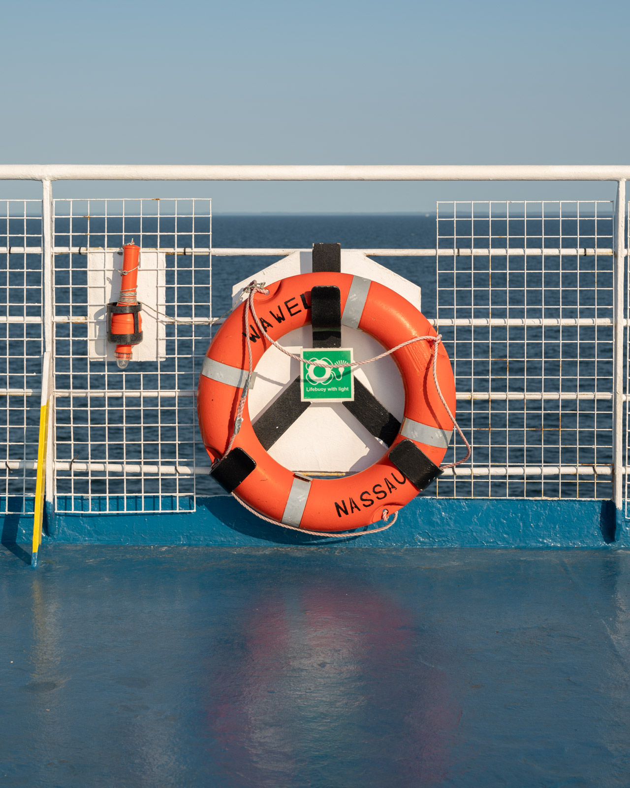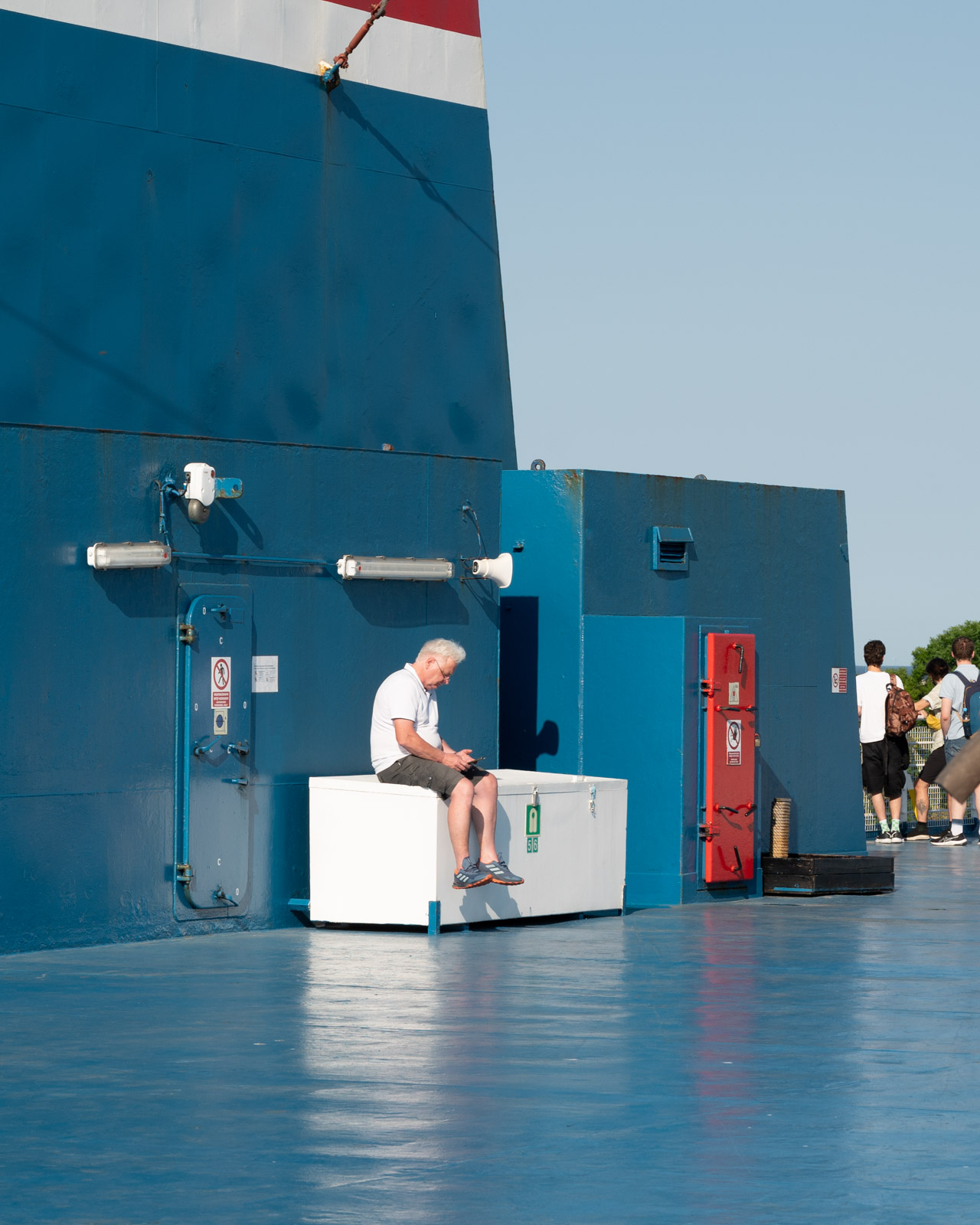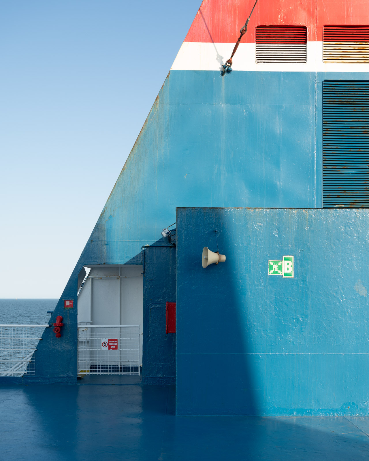Fähren sind fotografische Abenteuerspielplätze. Die Reise mit der M/F Wawel bestätigt den Eindruck, den ich auf der Moby Zaza auf unserer Reise nach Korsika bekommen habe. Wo das Blau oder Weiß der Farbe abplatzt, finden sich rostrote Stellen und rostige Schlieren, die vom Regen verwaschen wurden. Man kann die Schweißnähte durch die dicken Farbschichten hindurch sehen und Stellen erkennen, die unzählige Male übermalt wurden. Wichtige Gegenstände und Türen heben sich in einem Grellorange ab vom Rest des Schiffes.