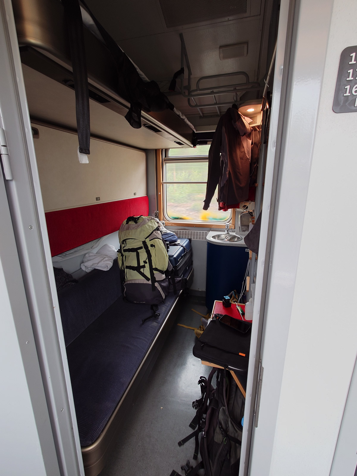 Unser Reich für die nächsten 12 Stunden: drei übereinanderliegende Betten, ein Waschbecken und reichlich Steckdosen. Logistisch schon zu zweit eine Herausforderung, aber irgendwie gemütlich. Im Wagen gibt es zwei Toiletten und eine geräumige und komfortable Dusche. Es dauert nicht lange, bis wir uns unter beachtlichem Schaukeln in die Kojen bewegen. Es ist gegen Mitternacht und es dämmert noch. Mir dämmert es, dass das die letzte Dämmerung für drei Wochen sein wird. Die Fichten- und Kieferwälder rauschen an uns vorbei, ab und zu hört man die Glocke eines Bahnübergangs an uns vorbeibimmeln. Selten halten wir kurz an einem Bahnhof. Das einzige Geräusch im Zuginneren kommt von der Lüftung. Ist sie mal aus, gleitet der Zug lautlos über die Schienen. Trotz des Geschaukels wird es eine erholsame Nacht. Erholsam auch der Morgen danach: Eine warme Dusche, ein mitgebrachtes Mandelbrot und frischer Kaffee vom Bordrestaurant sind gerade wahrer Luxus, den wir wirklich zu würdigen wissen. Es sind die Details, die zwischen erholsam und stressig entscheiden.