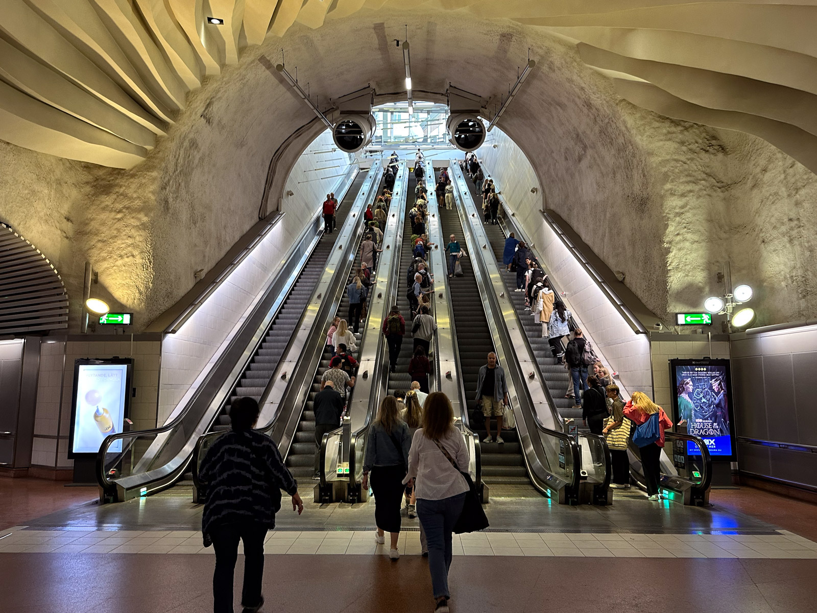 Die Zugfahrt von Nynäshamn nach Stockholm dauert eine knappe Stunde. Dann steigen wir am wohl imposantesten Bahnhof aus, den ich bislang gesehen habe. Der Bahnsteig ist durch einen zweiten Satz Schiebetüren zusätzlich gesichert. Unendlich lange Rolltreppen braucht es, bis wir in der Empfangshalle auf Bodenniveau stehen. Es geht hier geschäftig und hektisch zu. Insbesondere auf den Rolltreppen scheinen es die Schweden besonders eilig zu haben. Wer kann es ihnen verdenken, wenn man die lange Fahrt vielleicht sogar täglich machen muss? Und doch ertappe ich mich bei dem unsinnigen Gedanken die Menschendichte hier zu hinterfragen: "Aber hier leben doch nur 10 Millionen Menschen auf so riesiger Fläche". Stockholm kratzt an der Millionenmarke und natürlich ist Stockholm eine Metropole wie jede andere auch. Hier am Hauptbahnhof der Hauptstadt Schwedens hat das Gewusel nun wirklich nicht zu wundern. Selbst in Reykjavik haben wir am eigenen Leib erfahren, wie geschäftig eine Stadt sein kann, und wie hektisch ihr Straßenverkehr, auch wenn sie nur knapp die Hälfte der Einwohner Treptow-Köpenicks hat.