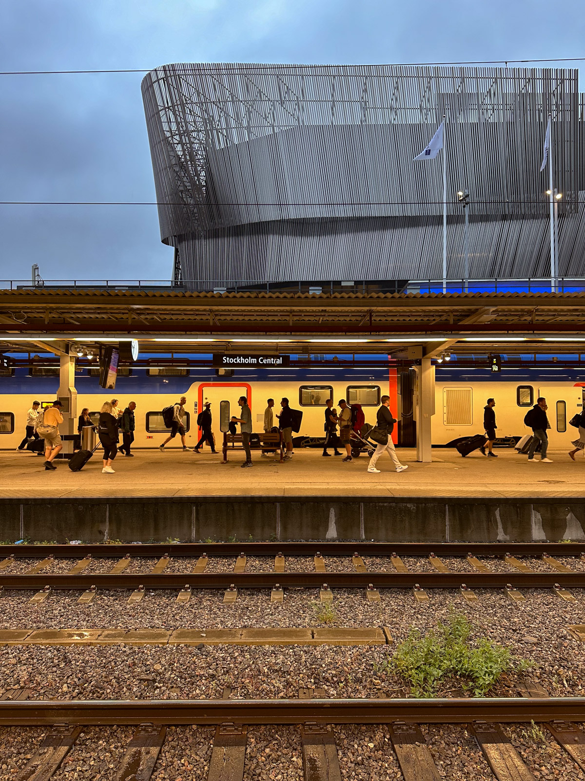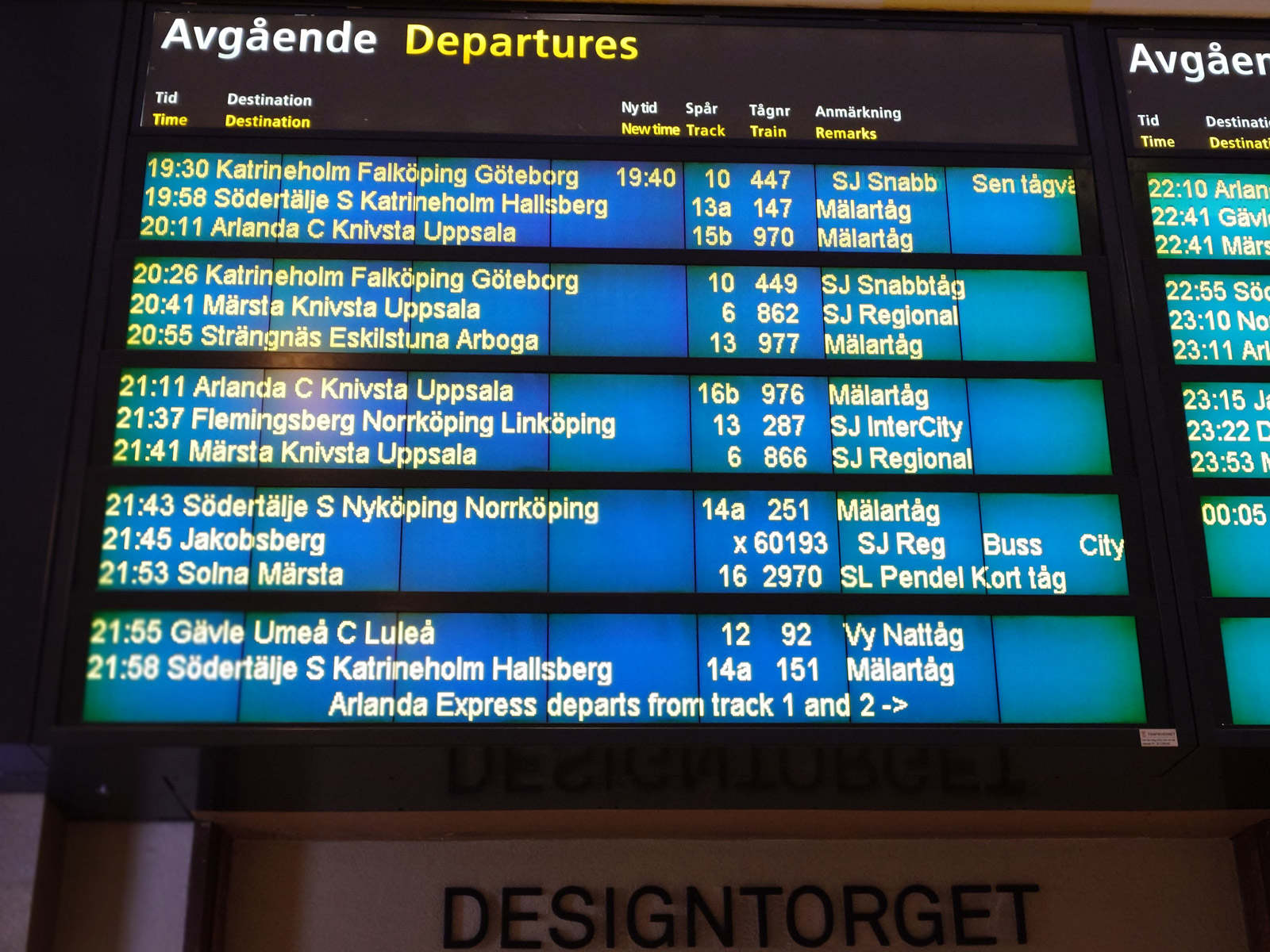 Unsere gebuchte Alternative stornieren wir erst, als wir den Zug in der stolzen Bahnhofshalle angeschlagen sehen und er Stelle um Stelle weiter nach vorne rutscht: 21:55 Vy Nattåg Nr 92 von Gleis 12.