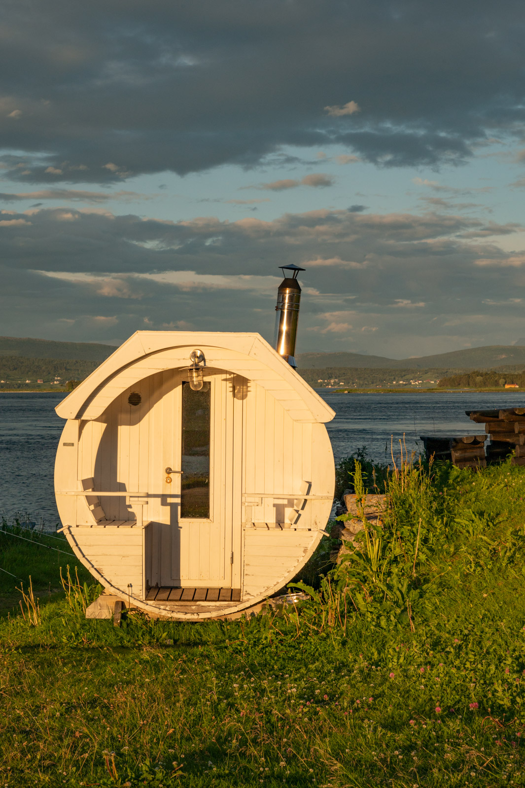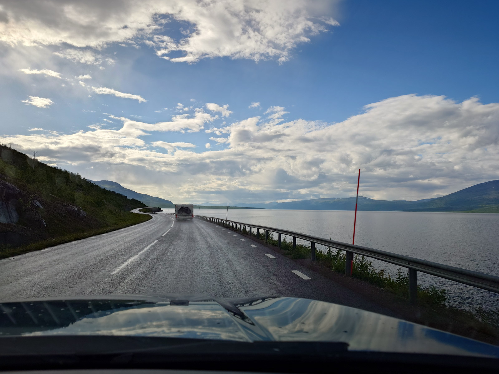 Unterbrochen von nur einem kurzen Versorgungsstopp im Supermarkt, denn die Preise sind hier deutlich günstiger als in Norwegen, fahren wir die E10 entlang. Sie führt auf schwedischer Seite fast durchgehend parallel zur Zugstrecke durch eine Gegend mit niedriger Vegetation. Schon allein für sich genommen haben diese Eindrücke etwas Besonderes. Es ist warm, aber bedeckt. Ab und zu blitzt die Sonne durch und ab und zu zieht ein Schauer über uns hinweg.