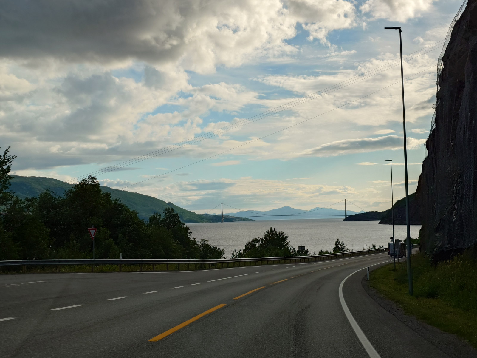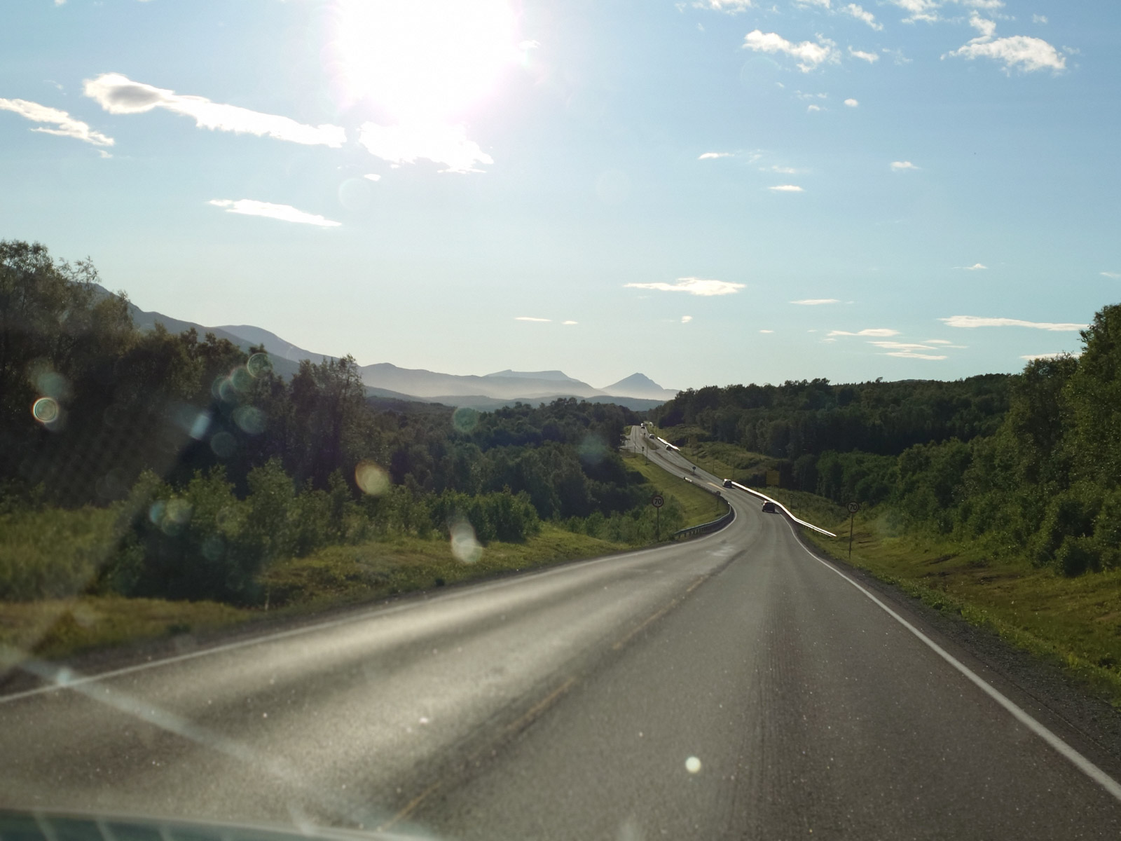 Ab einem Punkt, etwa 30 Kilometer von Narvik entfernt, markieren die riesigen Windräder auf dem Bergrücken das Ende des Höhenfluges und wir nähern uns allmählich wieder dem Meeresspiegel. Ein, zwei kleine Schauer noch und mit Befahren des östlichsten Auslegers der Lofoten, kurz hinter Bjerkvik, bricht die Sonne vollends durch. Übrig bleiben nur noch milchige Schlieren und kleine Wolkenfetzen. Willkommen im polaren Hochsommer!