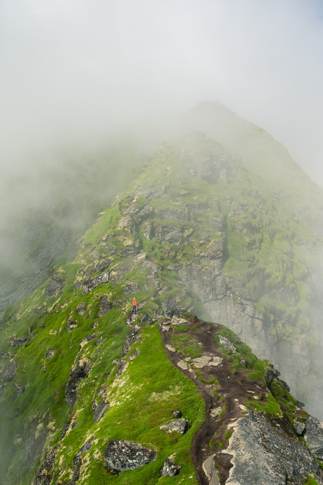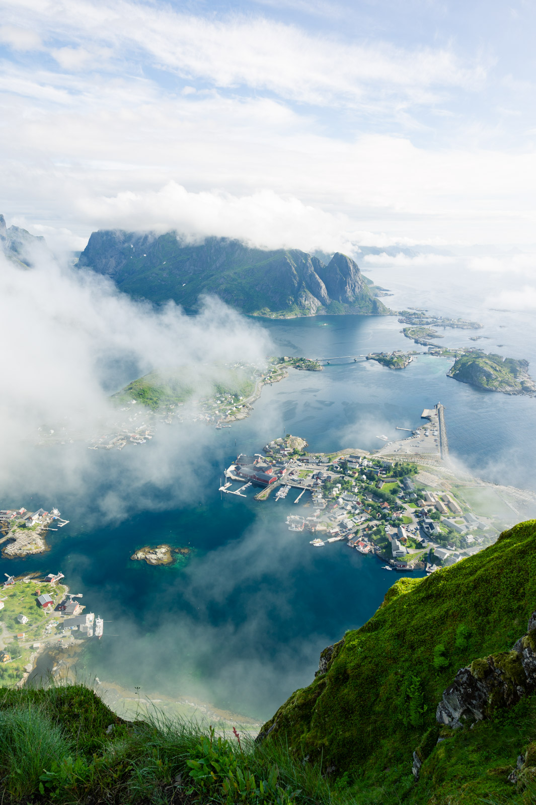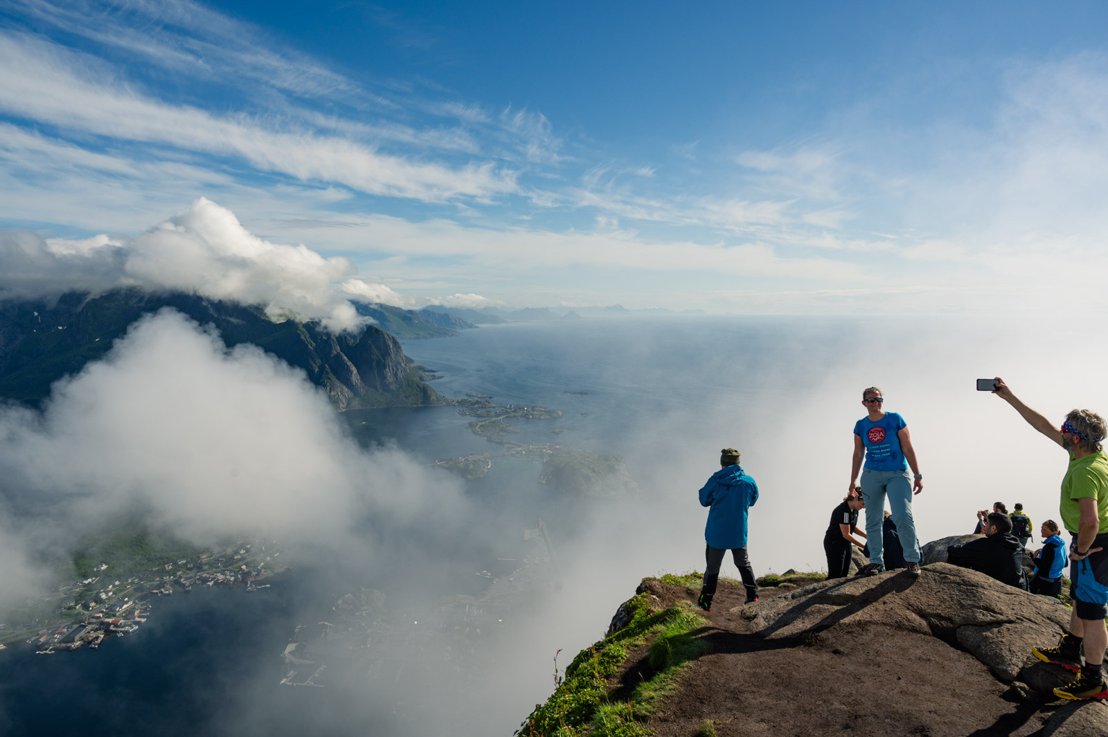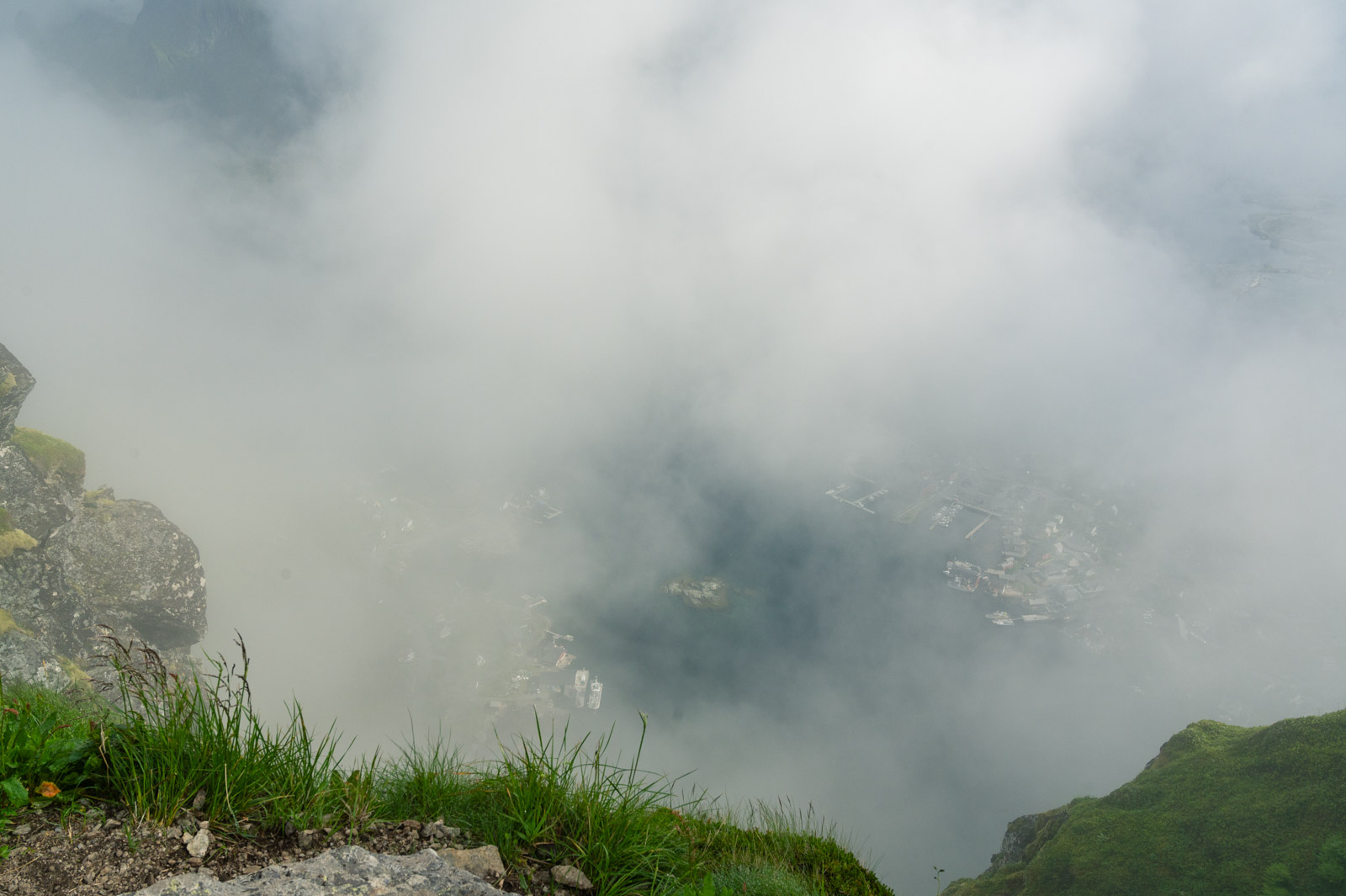 Ab und zu blitzt für kurze Zeit ein Stück vom Hafen Reines diffus durch die weiße Wand hindurch. Mit der Zeit werden die Abstände merklich kleiner bis sich die Wolkenfront vorerst gänzlich aufzulösen scheint. Übrig bleiben Wolkenfetzen, auf spannende Weise den Blick mal auf den einen Teil des Panoramas, mal auf den anderen freigeben. Das letzte kurze Stück bis zum Gipfel, diesmal ohne Steintreppen, lässt sich sehr gut bewältigen. Die Pause war erholsam, der Ausblick ist Motivation genug.