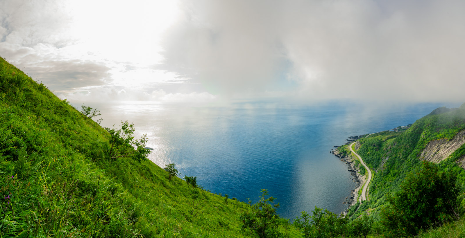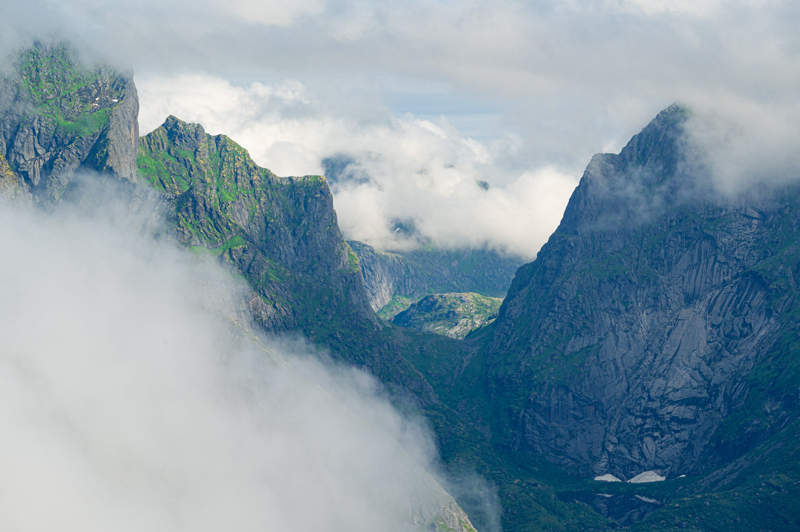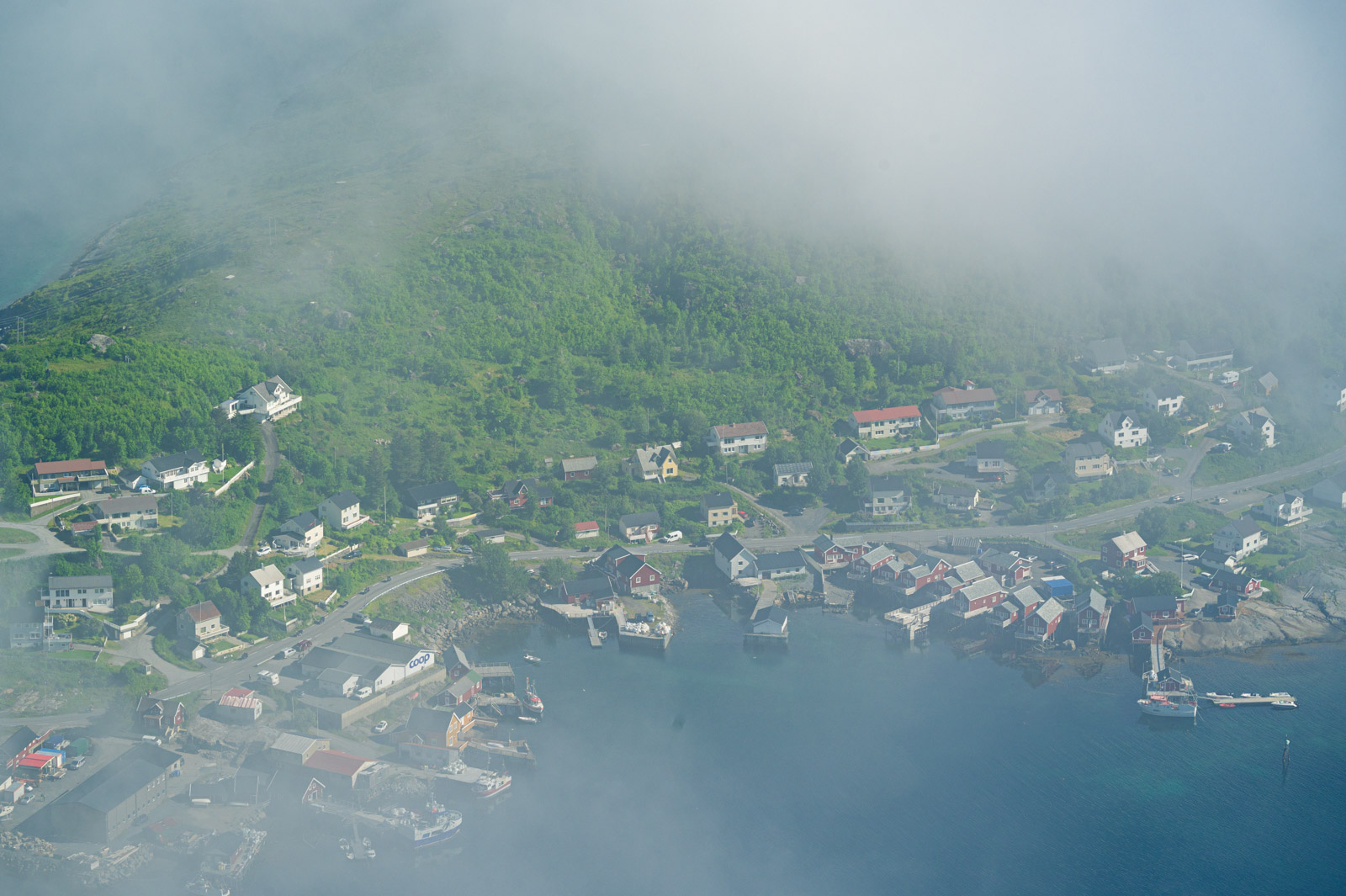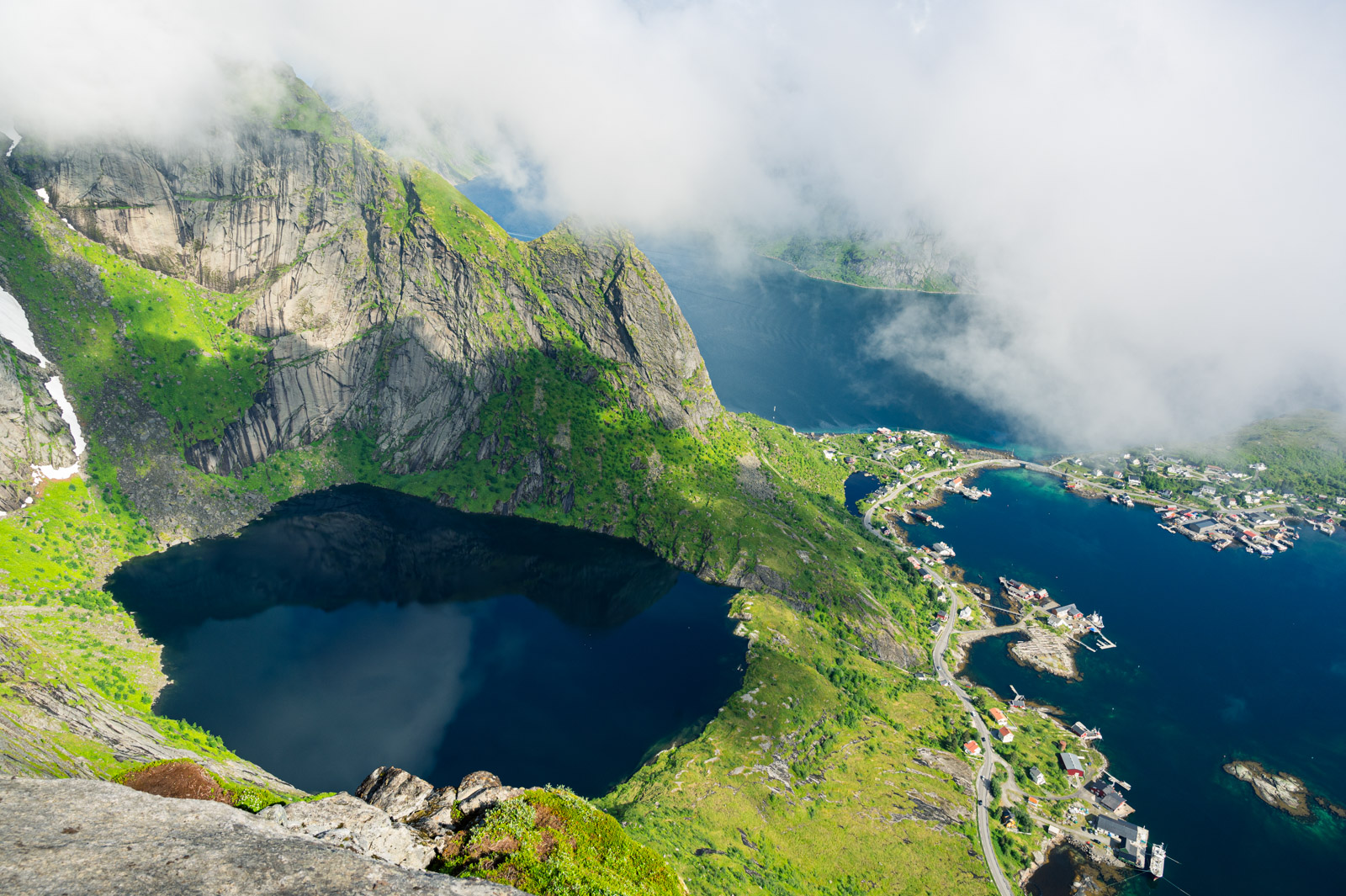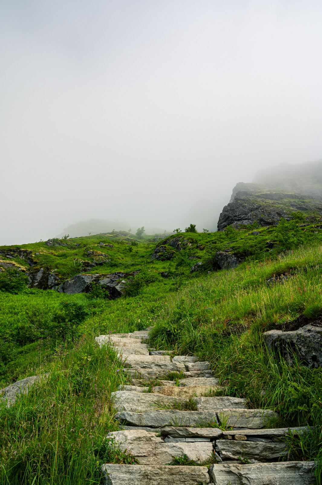 Ab und zu blitzt für kurze Zeit ein Stück vom Hafen Reines diffus durch die weiße Wand hindurch. Mit der Zeit werden die Abstände merklich kleiner bis sich die Wolkenfront vorerst gänzlich aufzulösen scheint. Übrig bleiben Wolkenfetzen, auf spannende Weise den Blick mal auf den einen Teil des Panoramas, mal auf den anderen freigeben. Das letzte kurze Stück bis zum Gipfel, diesmal ohne Steintreppen, lässt sich sehr gut bewältigen. Die Pause war erholsam, der Ausblick ist Motivation genug.
