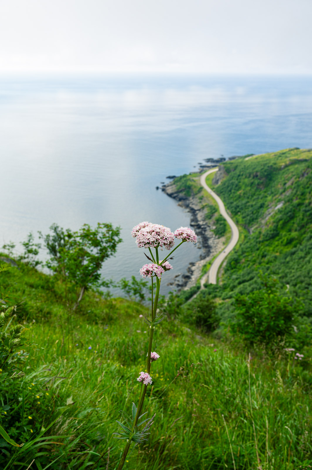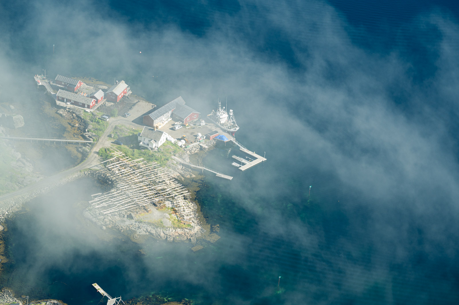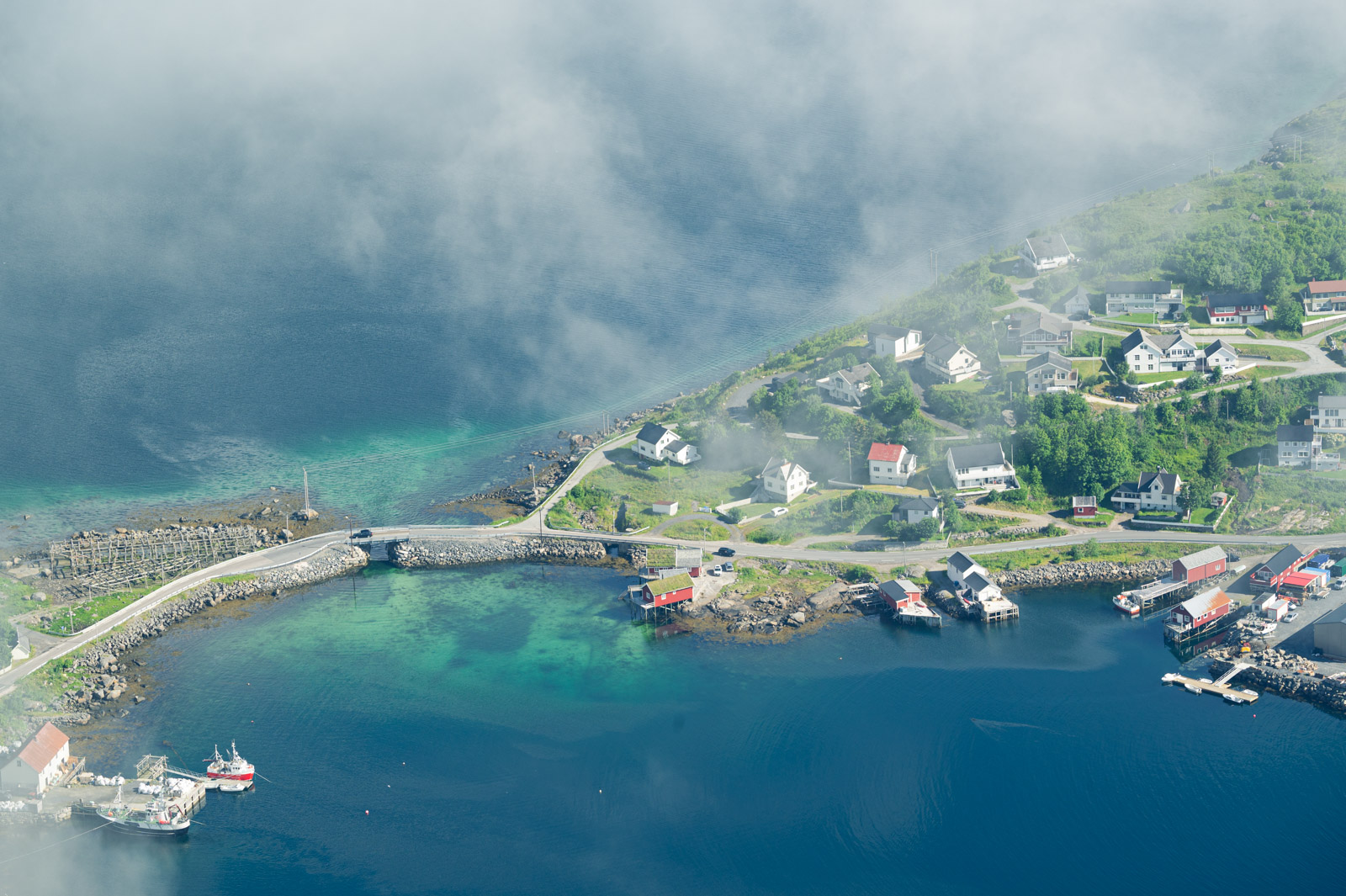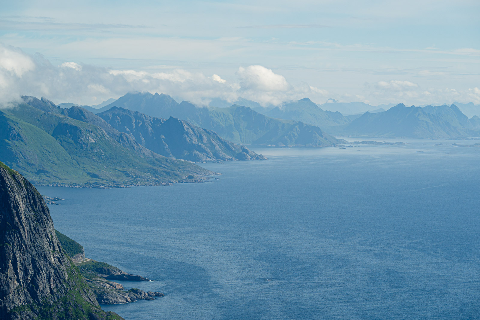 Ab und zu blitzt für kurze Zeit ein Stück vom Hafen Reines diffus durch die weiße Wand hindurch. Mit der Zeit werden die Abstände merklich kleiner bis sich die Wolkenfront vorerst gänzlich aufzulösen scheint. Übrig bleiben Wolkenfetzen, auf spannende Weise den Blick mal auf den einen Teil des Panoramas, mal auf den anderen freigeben. Das letzte kurze Stück bis zum Gipfel, diesmal ohne Steintreppen, lässt sich sehr gut bewältigen. Die Pause war erholsam, der Ausblick ist Motivation genug.