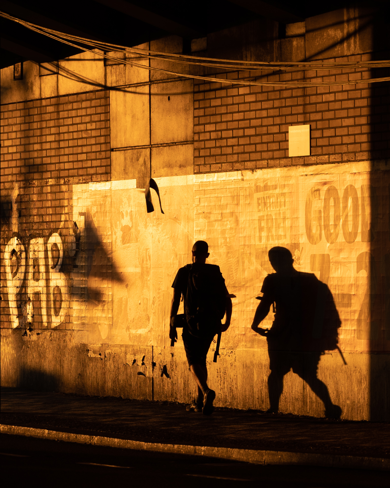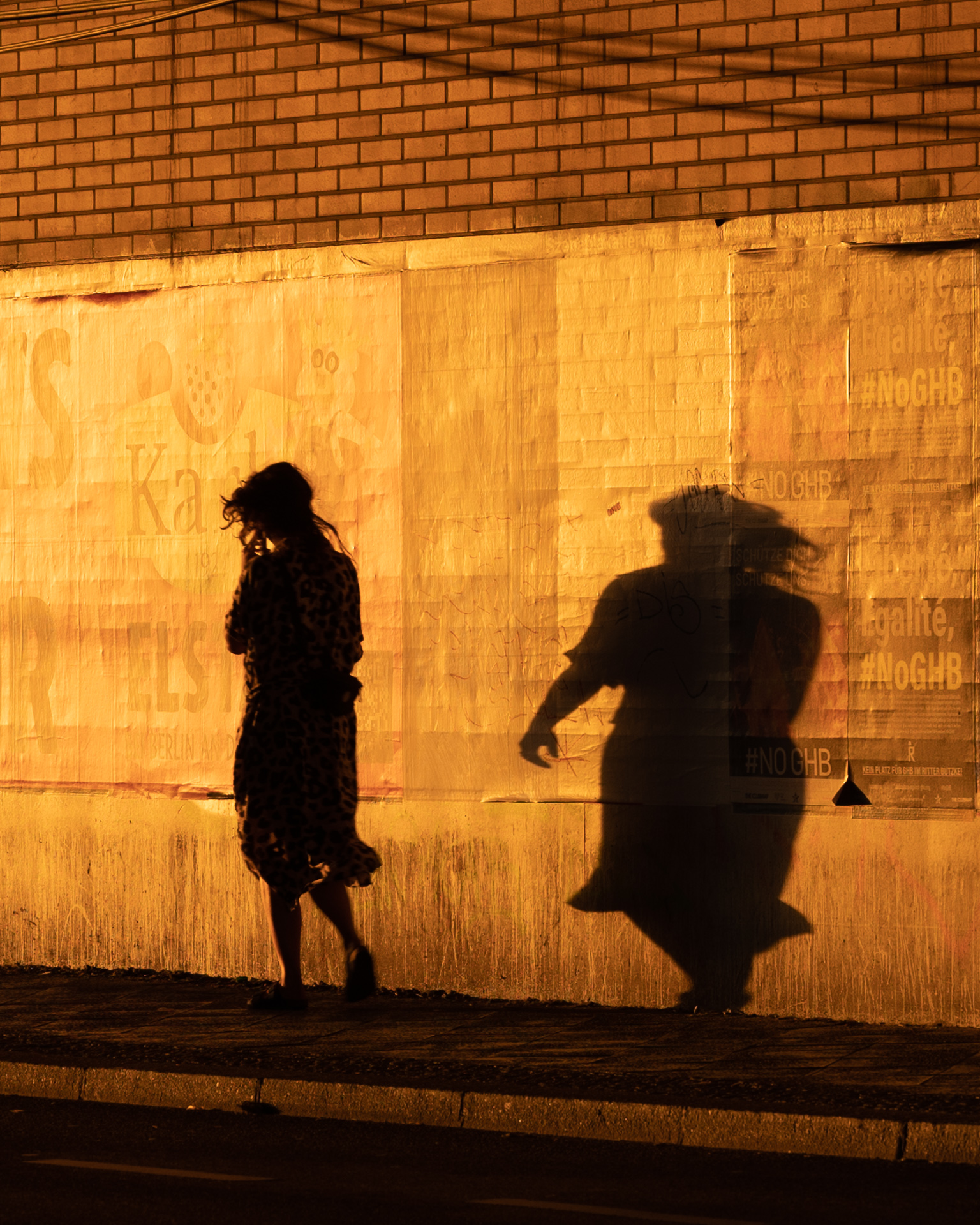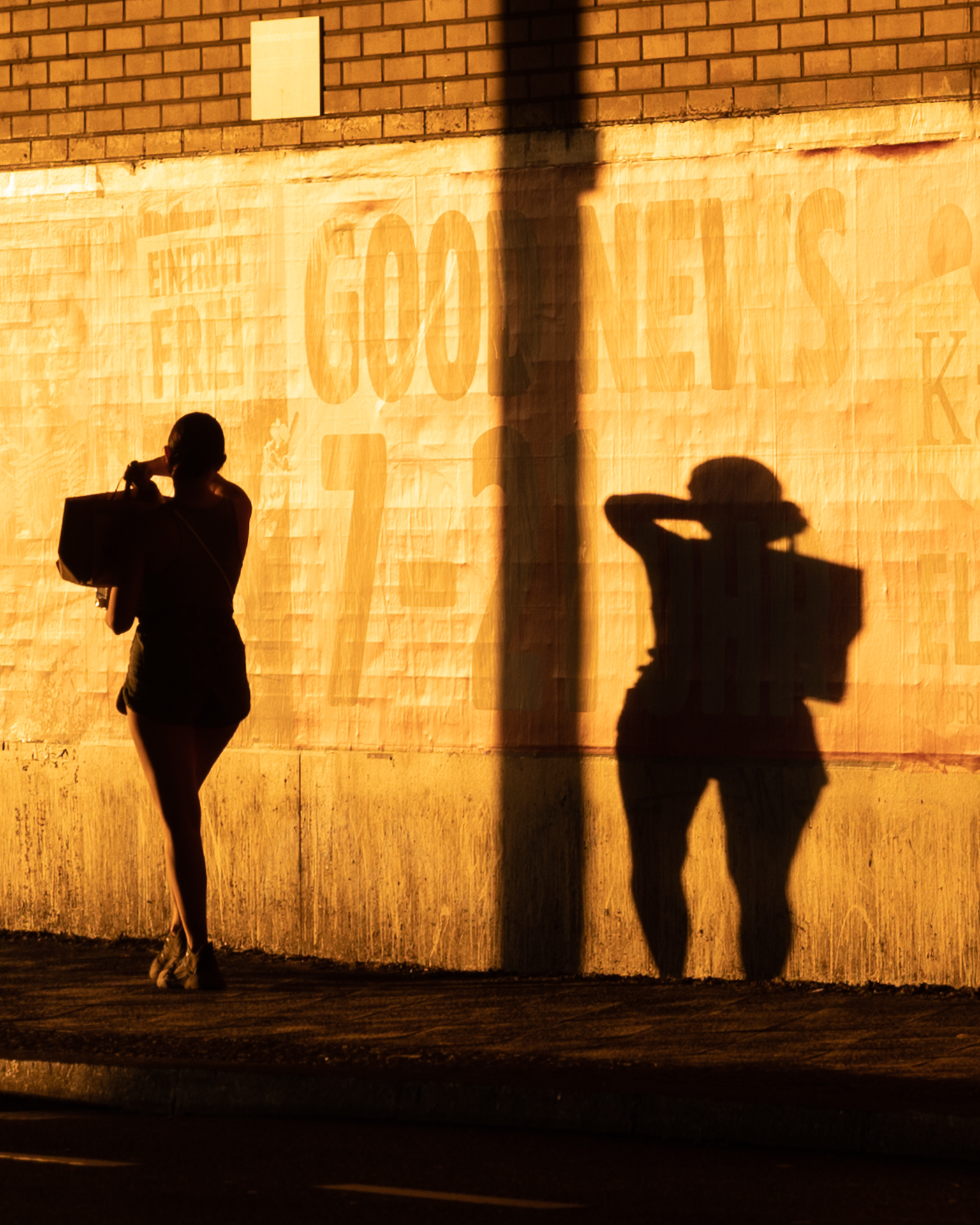 Ich habe heute Abend eigentlich einen langen Spaziergang im Sinn, bleibe aber stehen, als ich die Silhouetten der Menschen vor der plakatierten Wand sehe. Ein Plakat schreit "GOOD NEWS". Die Menschen treiben ihren Schatten vor sich her. Andere werden von ihm getrieben. Manche Schatten sehen ihren Besitzern ähnlich, andere nicht. Heute lasse ich die anderen die 10000 Schritte machen und bleibe einfach stehen, bis die Sonne hinter der Stadt verschwindet.