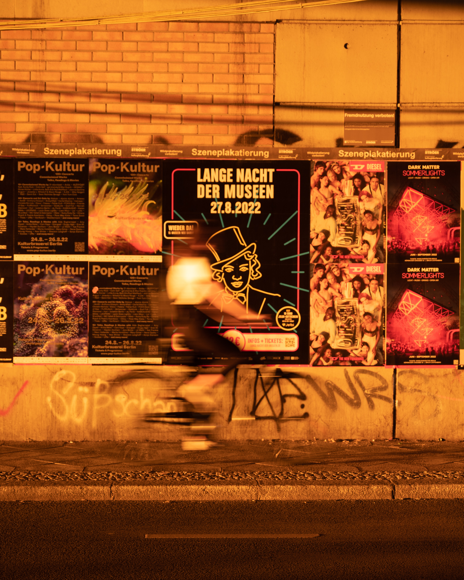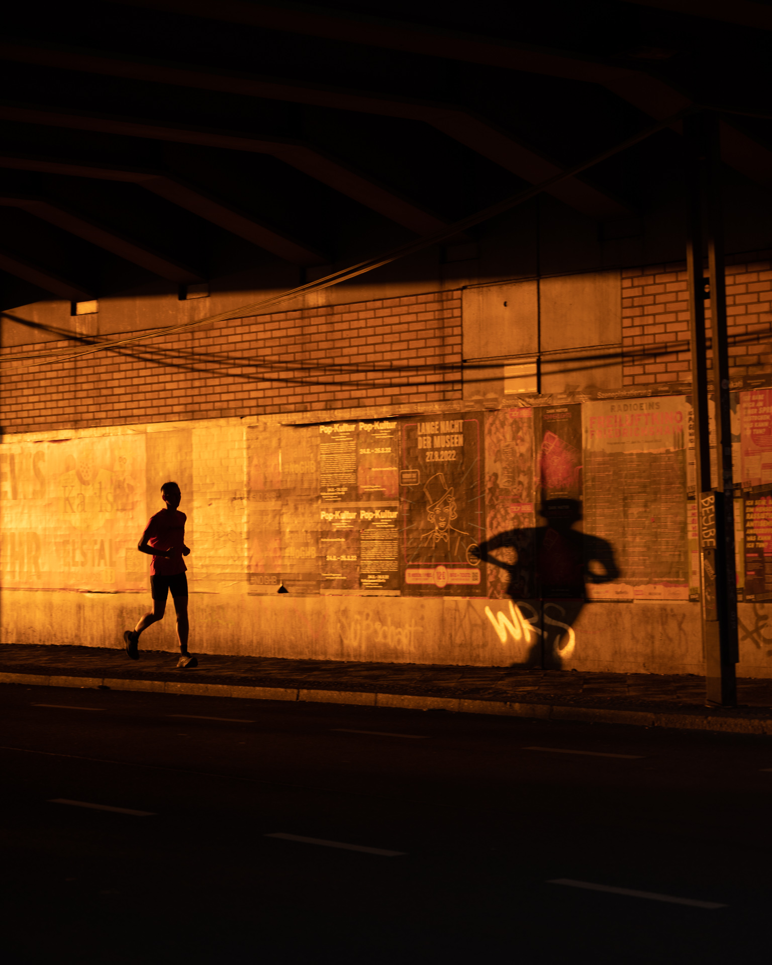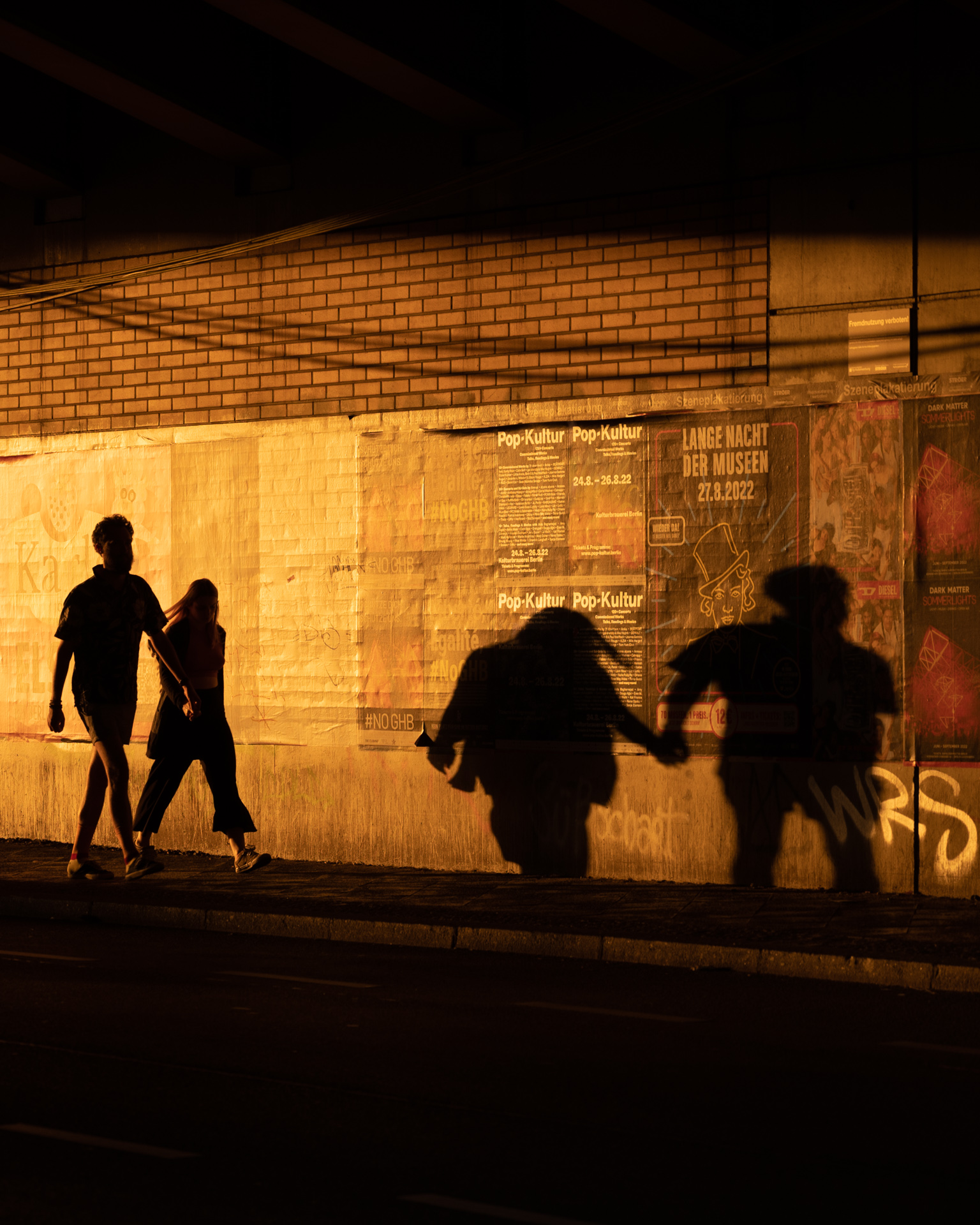 Es ist ein warmer Sommerabend im August 2022, das Licht ist gleißend. Die Sonne steht tief und scheint die Spree entlang in die Unterführung. Ab und zu drängelt sich eine Wolke dazwischen und es kehrt diffuse Normalität in die Lichtstimmung.